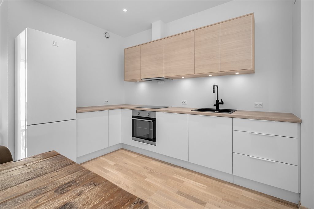 Kjøkkenet har innredning med glatte fronter. Benkeplaten er av laminat. Det er kjøkkenventilator med avtrekk ut.