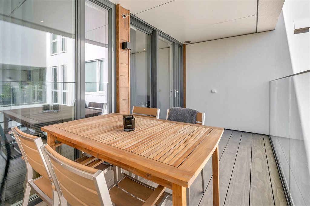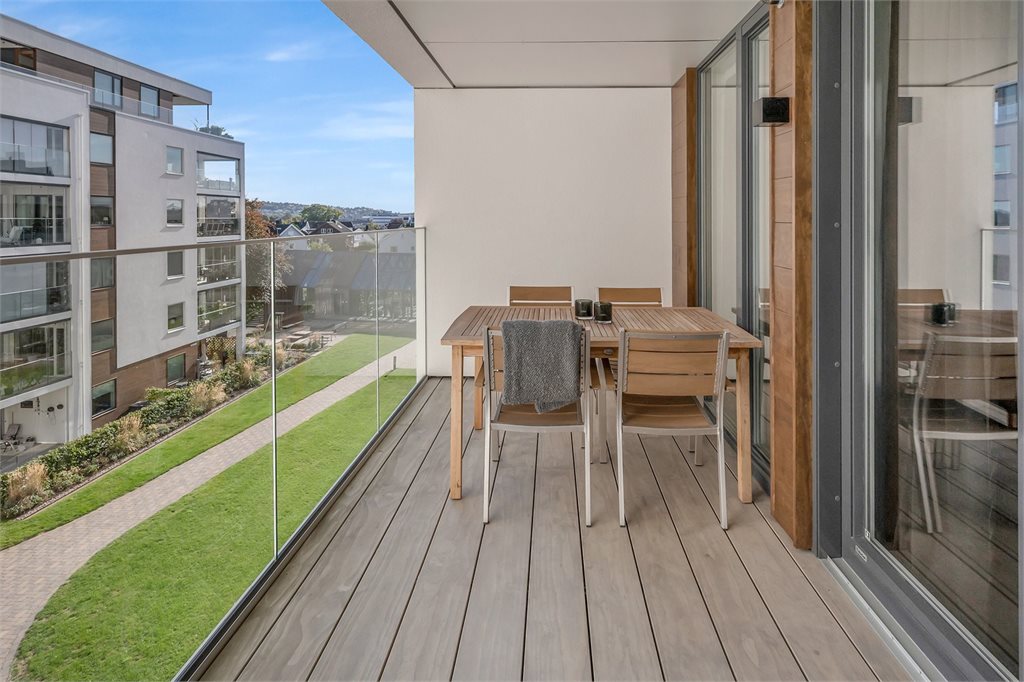 med brann- og lydbeskyttende egenskaper mot fellesareal. Balkong/terrasse med dekke av terrassebord. Rekkverk av glass og metall.