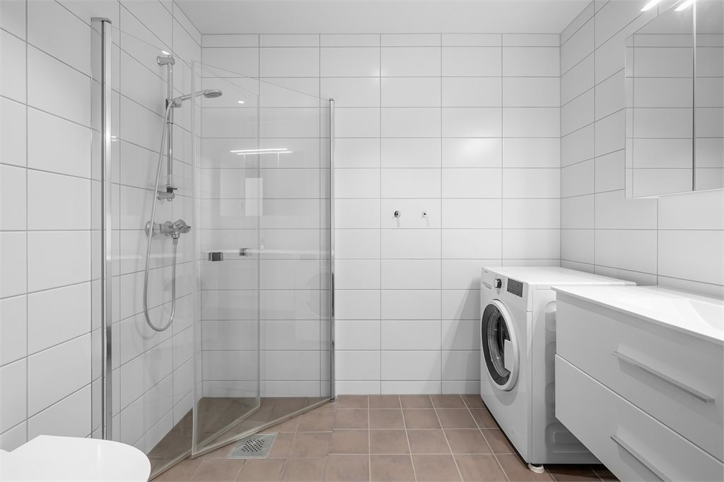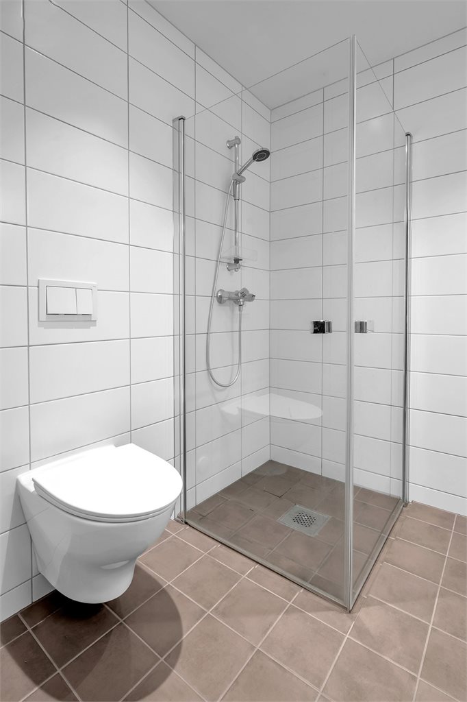 Det er fliser på veggene og malte plater i tak. Det er fliser på gulvet med vannbåren varme som varmekilde. Gulvet har jevnt fall med lokalt nedsenket dusjsone, det er målt ca 30mm høydeforskjell fra gulv ved dørterskel til topp slukrist. Det er plastsluk og smøremembran med dokumentert utførelse.