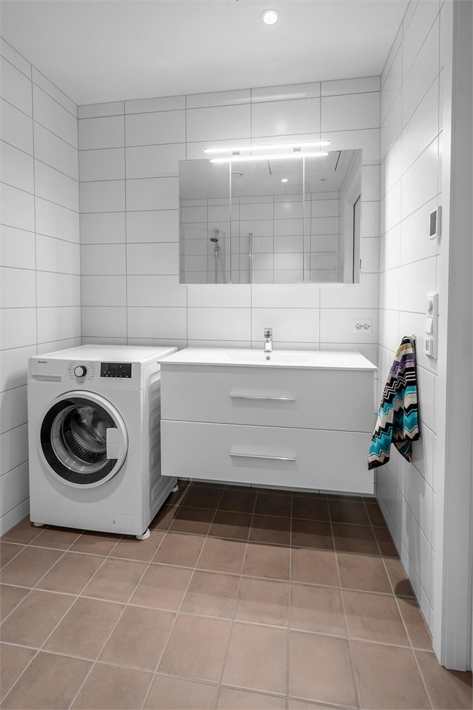 Rommet har innredning med nedfelt servant, veggmontert toalett, dusjvegger/hjørne og opplegg for vaskemaskin. Badet har balansert ventilasjon med avtrekk i tak og tilluftsspalte i dør. Hulltaking er ikke foretatt da det er tilgang til konstruksjonen via skap. Fuktmåling er foretatt, uten å påvise unormale forhold.