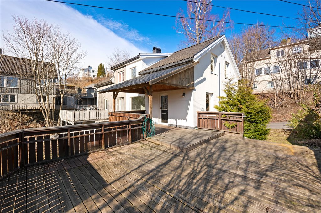 Terrassen er visuelt kontrollert. Overflatebordene har begynnende oppsprekking og slitasje i overflatebehandlingen. Rekkverket er fast, men har enkelte områder med begynnende råteskader i toppbordet. Konstruksjon og bæresøyler virker stabile uten tegn til vesentlige deformasjoner. Dreneringen vurderes som tilfredsstillende med synlig fall bort fra fasaden. Ingen tegn til setninger eller alvorlige konstruksjonsskader. På grunn av snø på befarings-tidspunktet var det ikke mulig å vurdere terrassen i sin helhet.