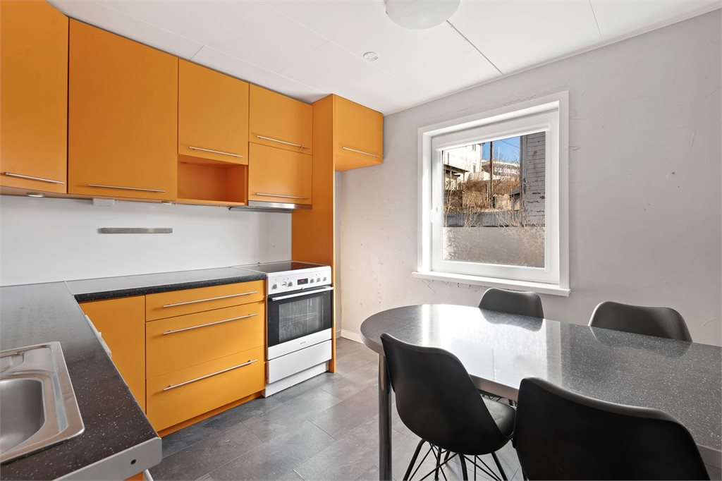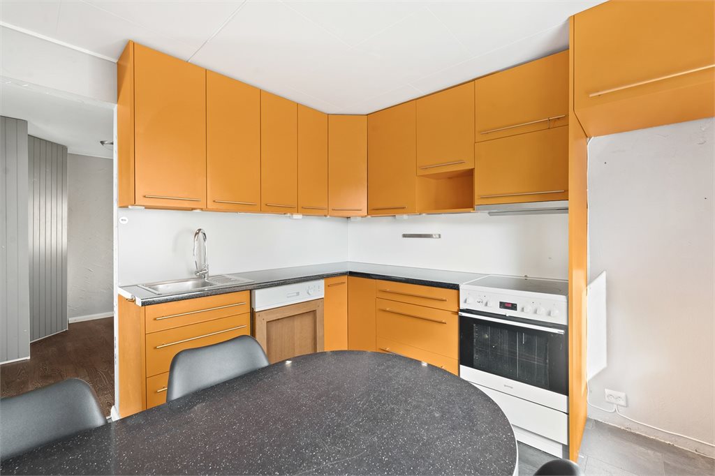 Innredningen opprettholder fortsatt tiltenkt funksjon, men tidspunkt for utskiftning nærmer seg. Skader på overflater og kjøkkeninnredning bør utbedres for å unngå ytterligere forringelse og redusert brukskvalitet.