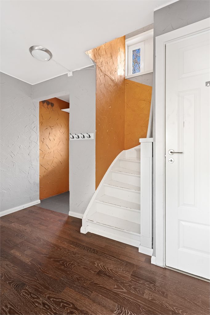 Trappene har vanger og trinn av tre. Det er ikke montert håndløper.