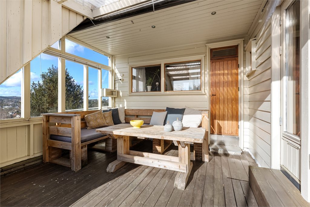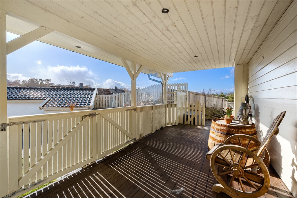 Veranda med utgang fra stue i 2.etasje. Dekke av terrassebord. Rekkverk av tre.