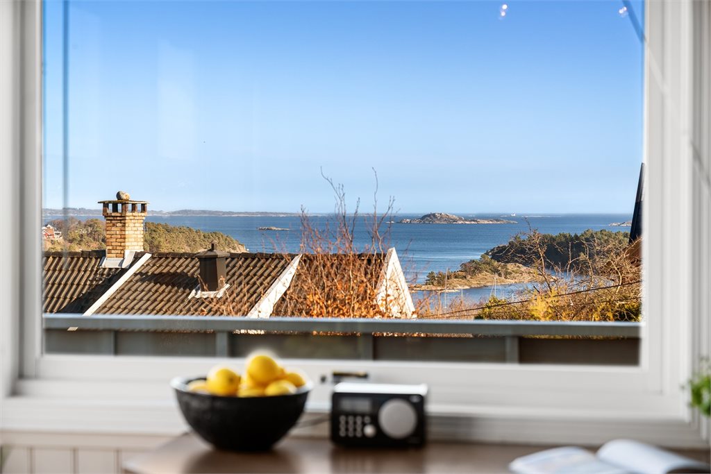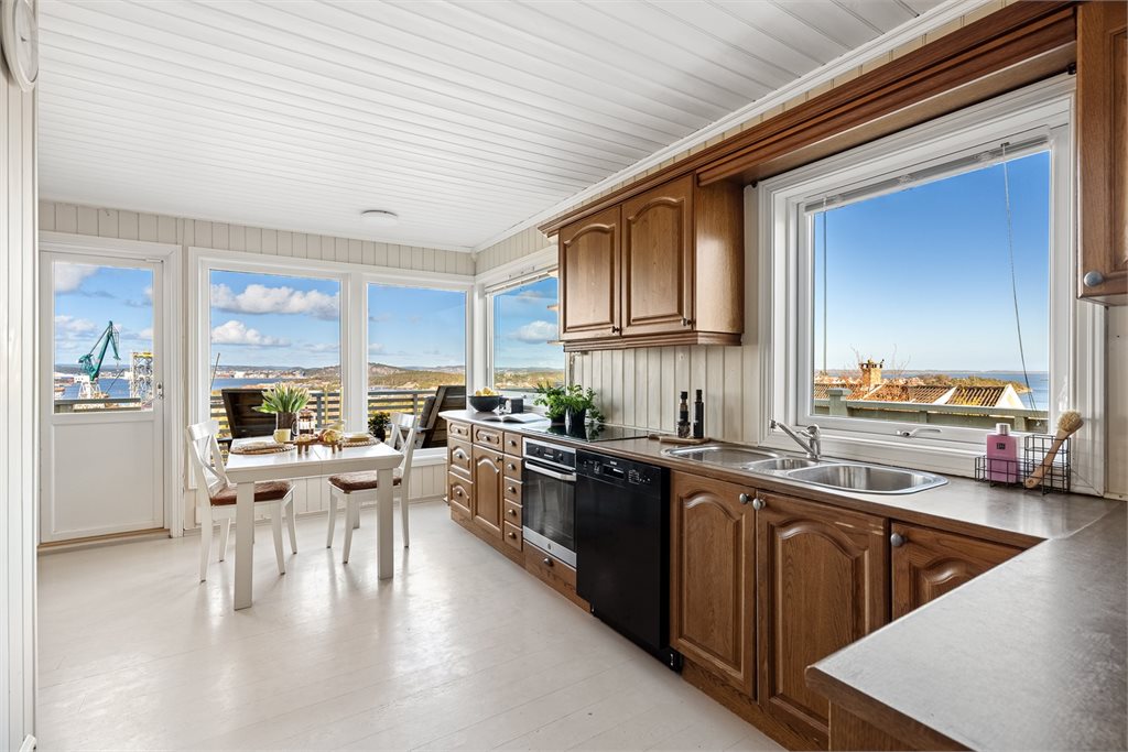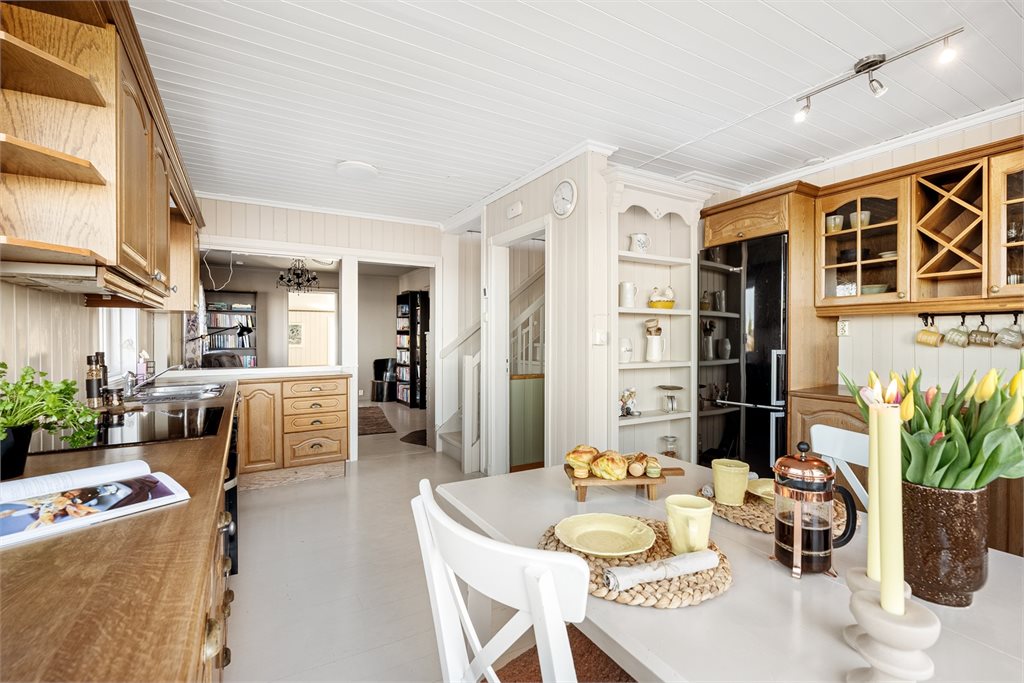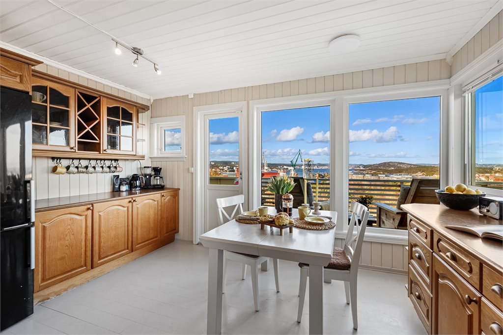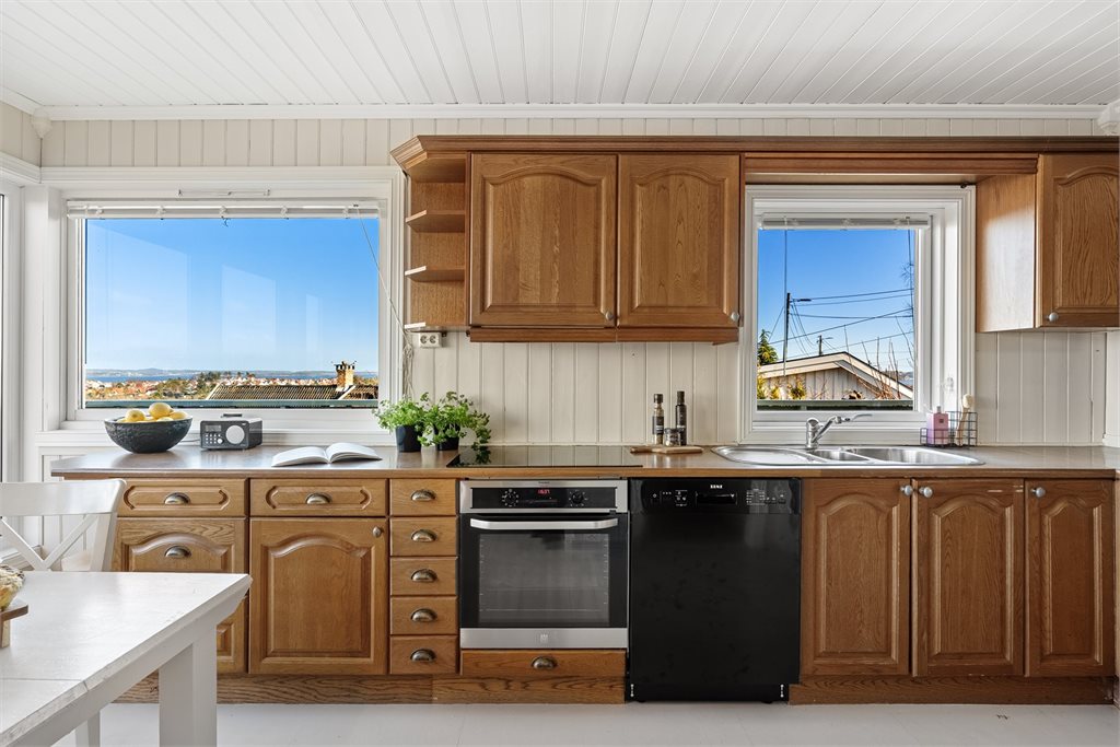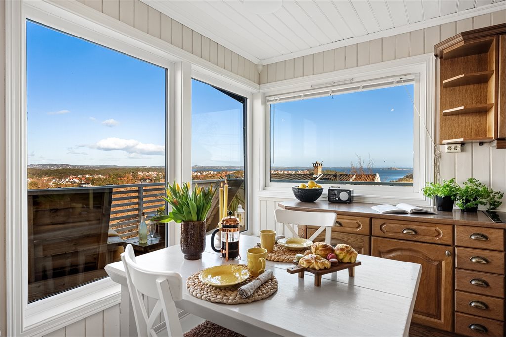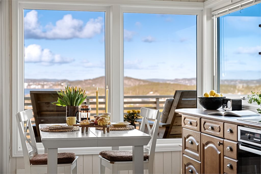 - Kjøkken med en helt fantastisk utsikt fra vinduene. Kjøkkenet har en meget romslig innredning med god skap- og benkeplass og god plass til spisebord. Utgang til den solrike terrassen.