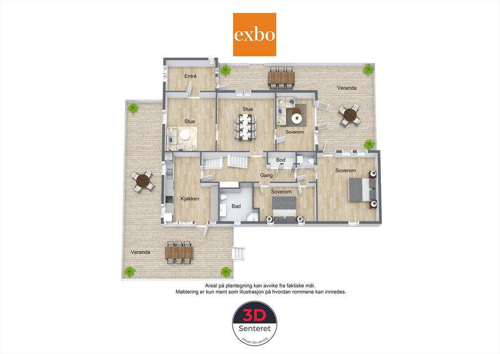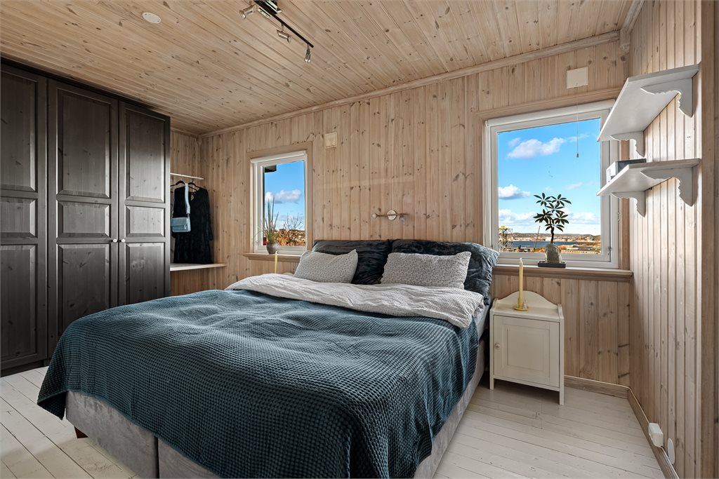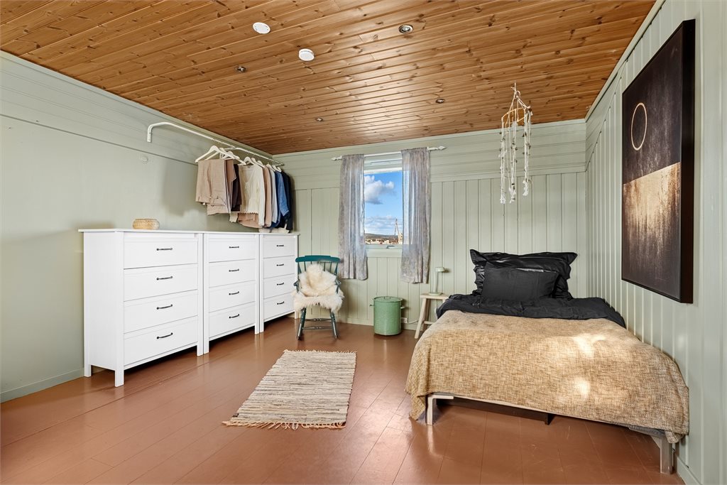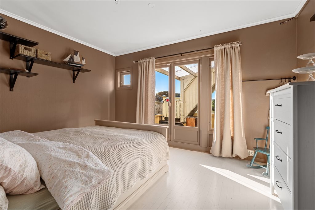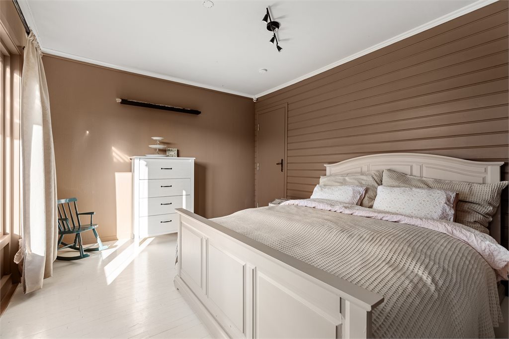 - 3 soverom av god størrelse. Hovedsoverom er opprinnelig 2 soverom, men vegg mellom er blitt åpnet. Dette er ikke en søknadspliktig endring og kan enkelt reverseres ved å sette tilbake opprinnelig vegg mellom rommene hvis man ønsker 4 soverom. De to andre rommene har utgang til platting.