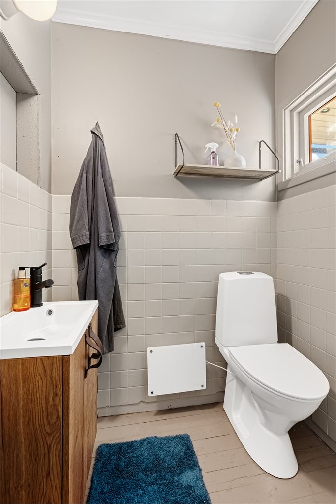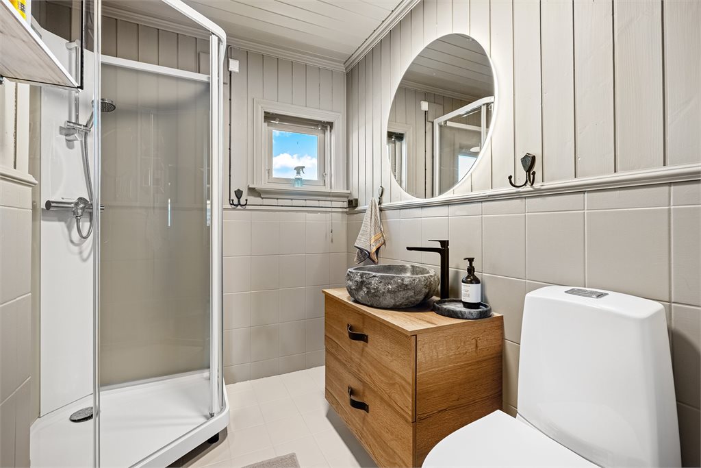 - Flislagt bad med dusjkabinett, toalett, servant/skålvask med underskap. Elektrisk avtrekksvifte. Badet er oppgradert i 2022/23 med ny innredning og dusj. Varmekabler i gulv.