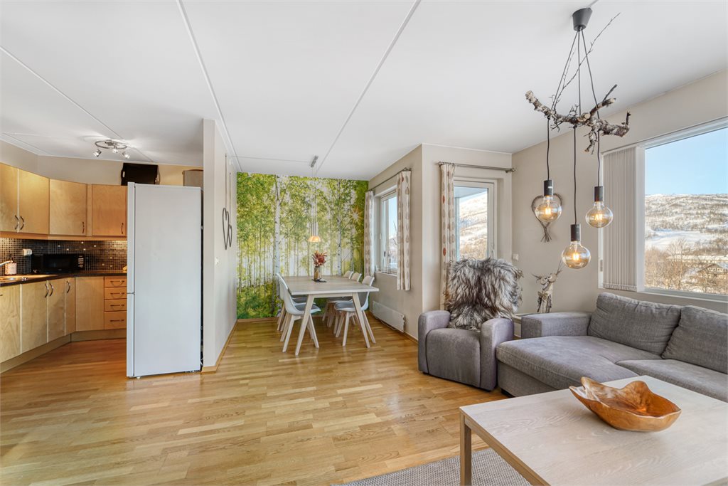 Leiligheten ligger i høy 1.etasje med kveldsol og flott utsikt mot Nos, Hovdenut, samt fjellene i nord/øst. Gåavstand til alle Hovdens fasiliteter som sentrum med sport og mat-butikker og kafè'er, post og bank. I tillegg til skisenter, turløyper, skøytebane, badeland og badeplasser i elva. Lysløypa går rett på utsiden av bygget.Parkering