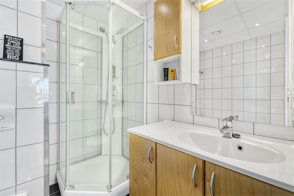 Våtrommene har flislagte flater på vegg og gulv.