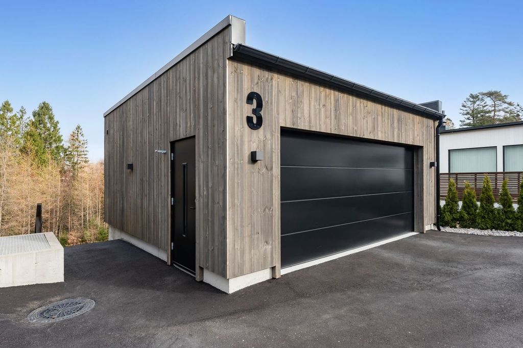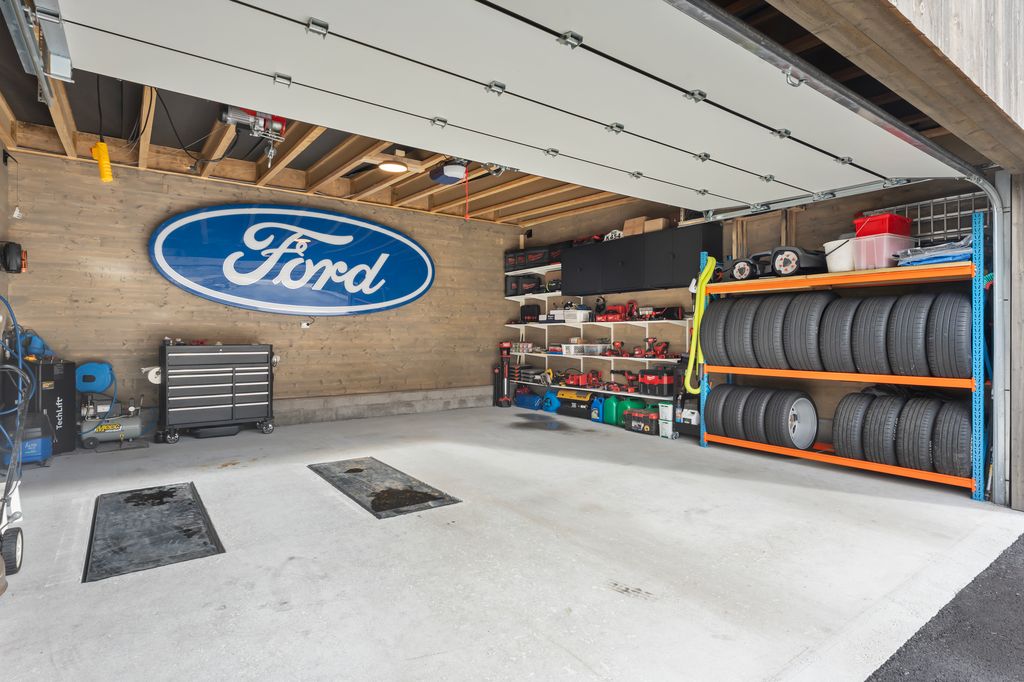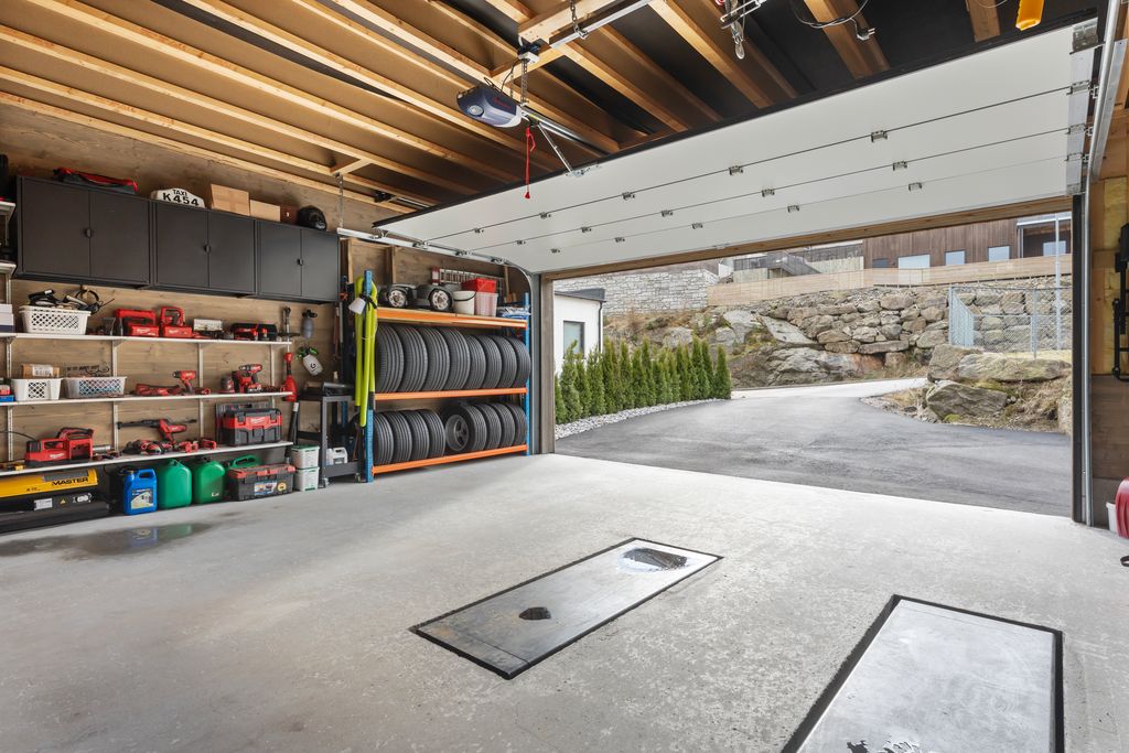 - Kjekk garasje med gode lagringsmuligheter. EL-bil lader