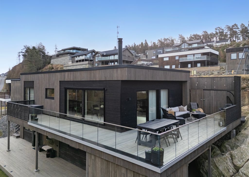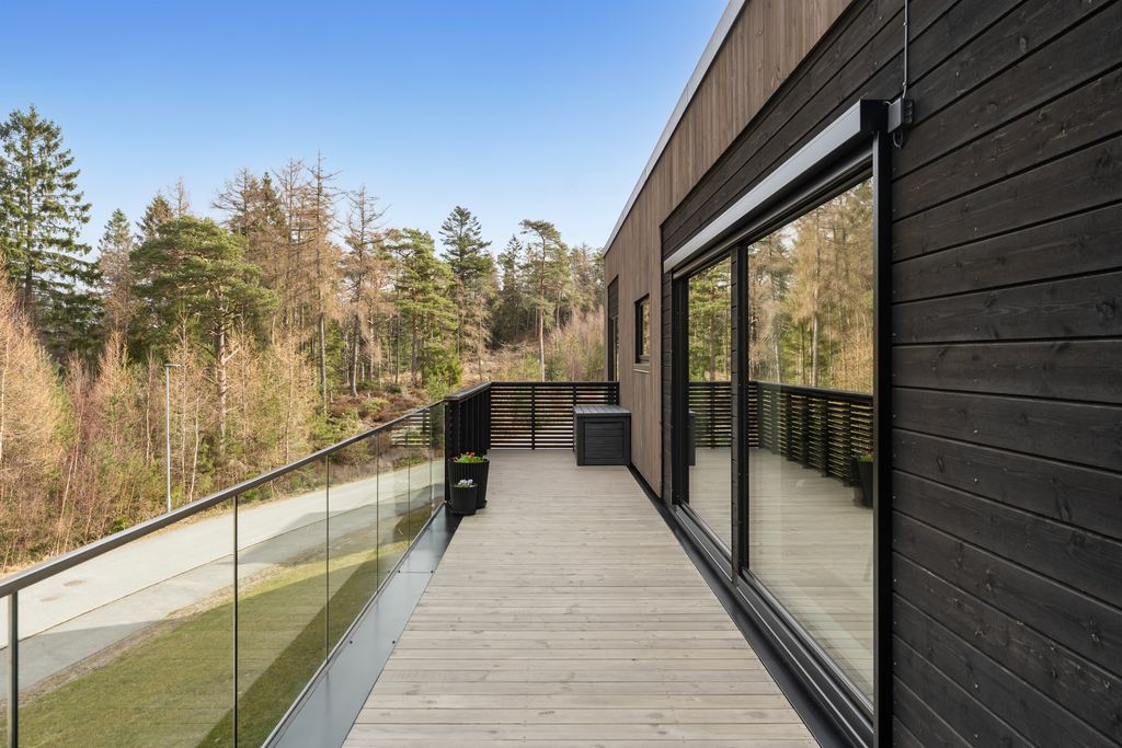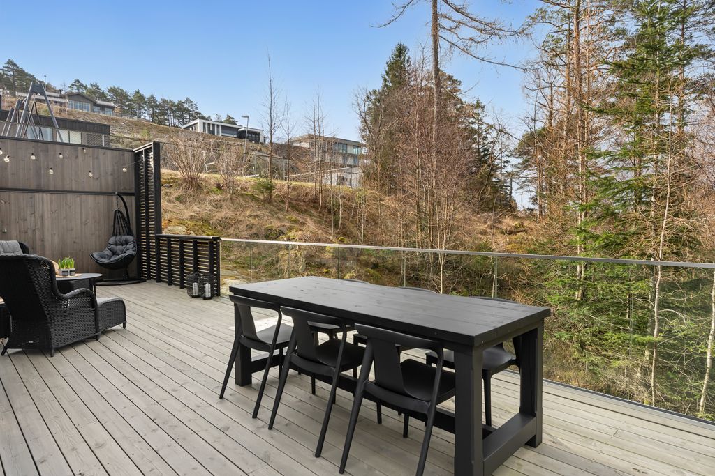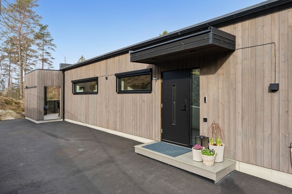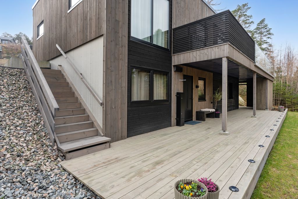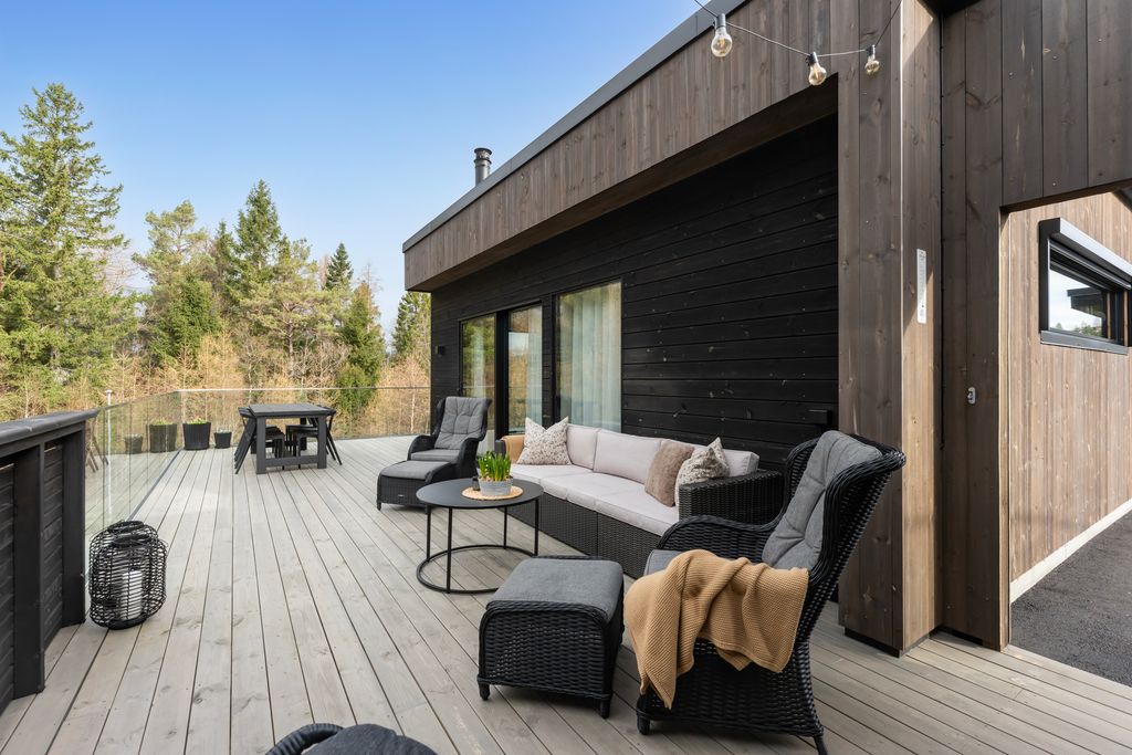 Boligen ligger solrikt til med flott anlagt veranda. Området tilbyr