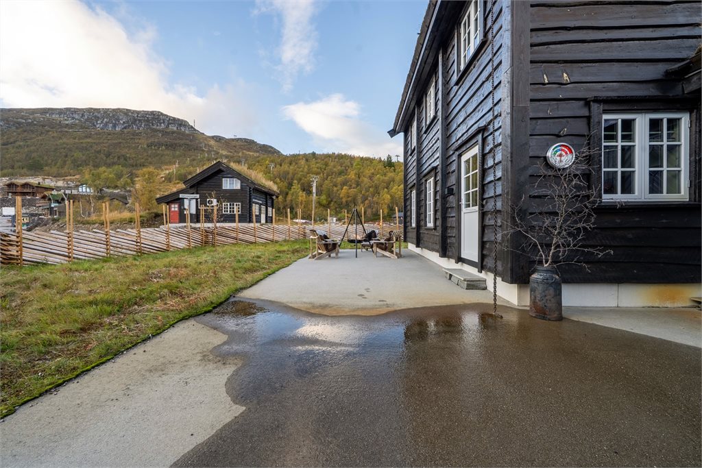 Hytten ligger på endetomt og er opparbeidet med plenomårder samt støpte betong områder - Gruset innkjørsel.Standard