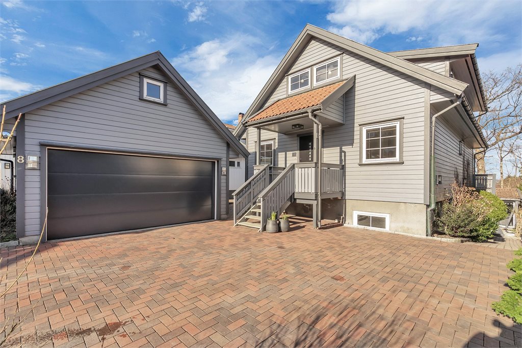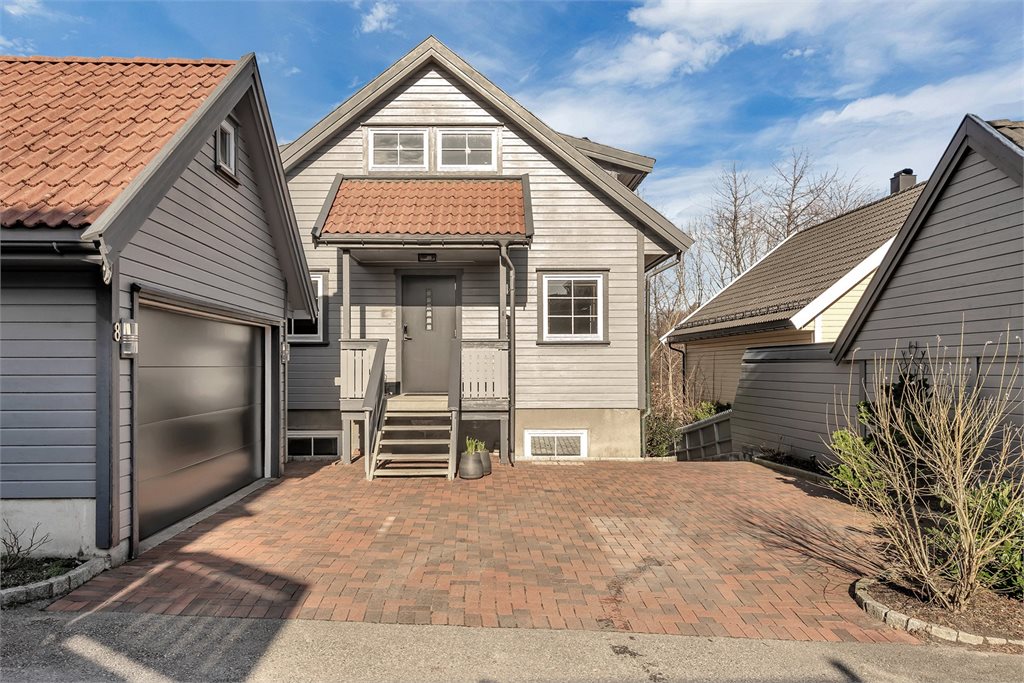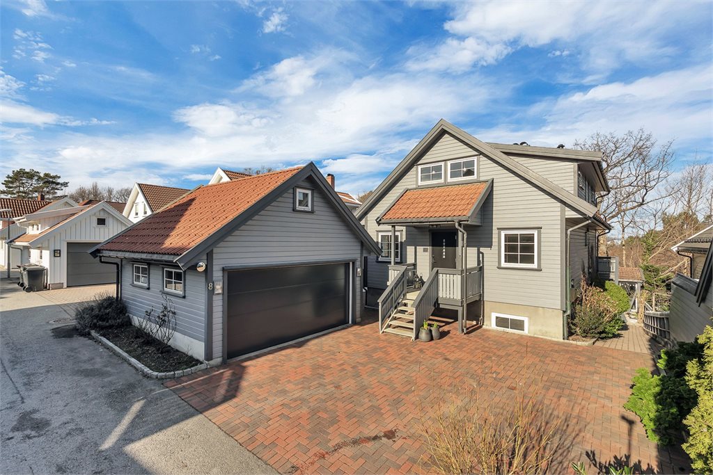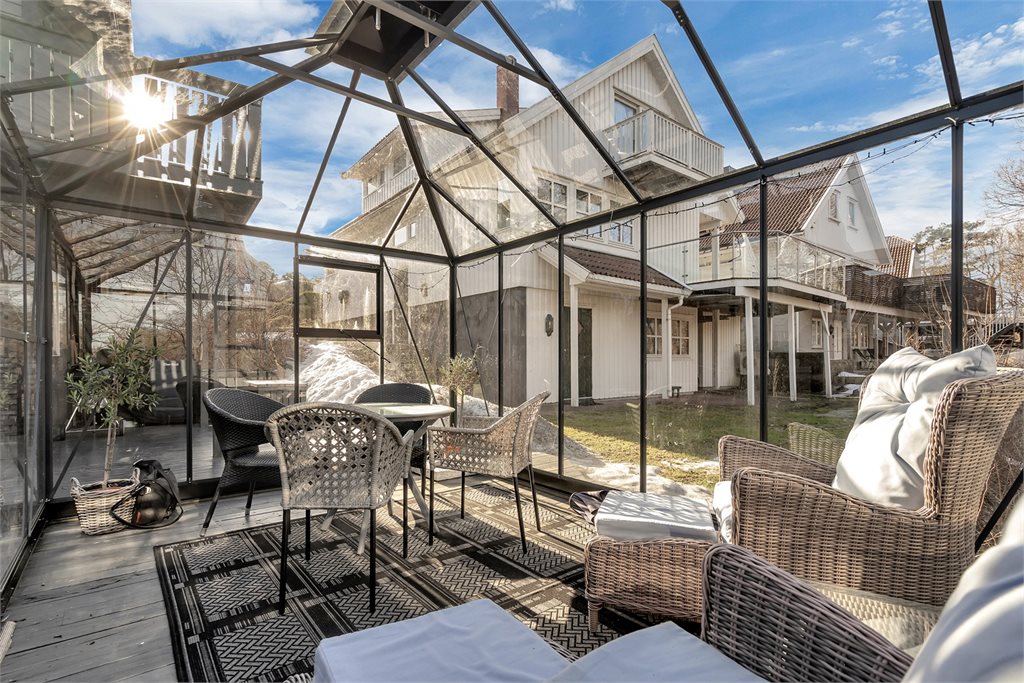 Pent opparbeidet tomt meg gårdsplass med belegningsstein, diverse beplantning og stor terrasse med hagestue og drivhus.Standard