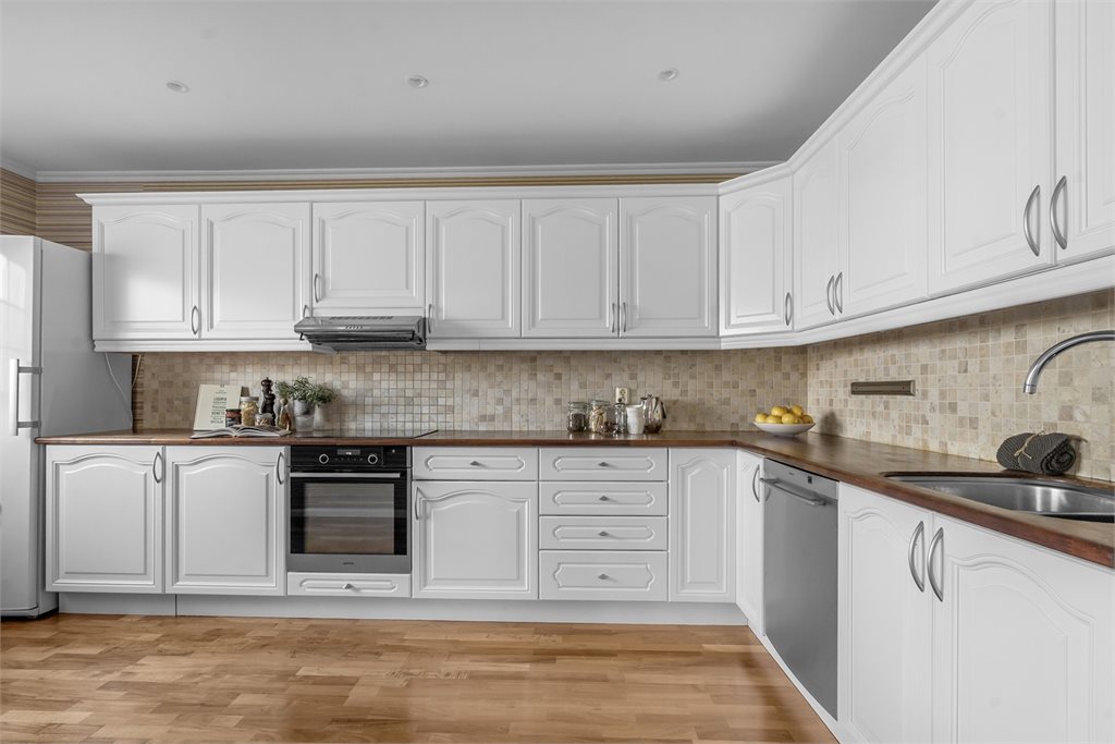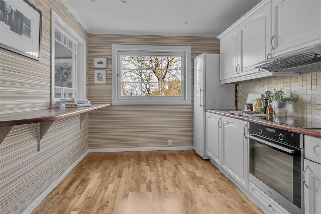 Kjøkkenet har innredning med profilerte fronter. Benkeplaten er av
