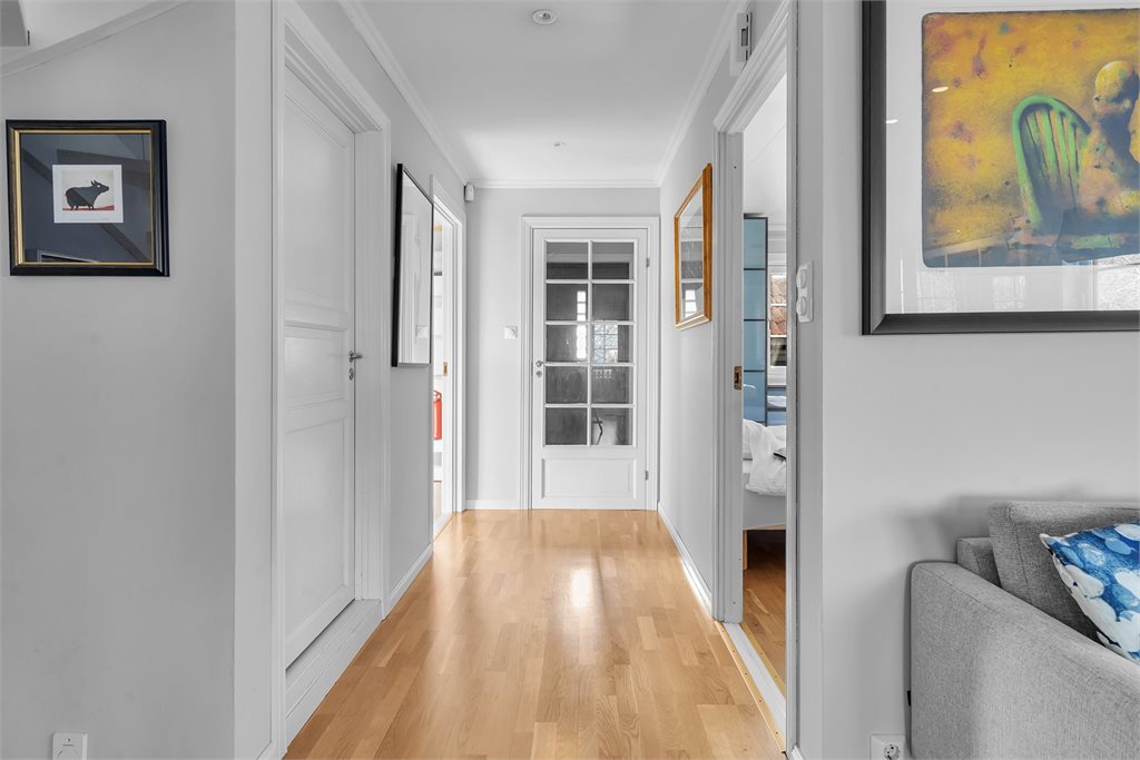 Innvendig har boligen malte fyllingsdører av tre.