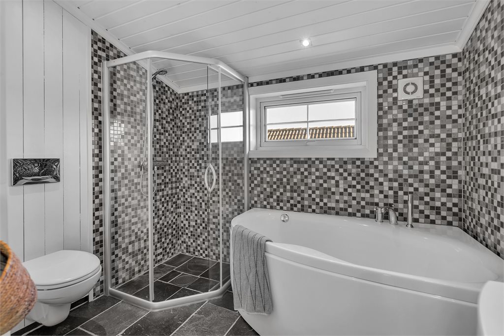 Rommet har innredning med nedfelt servant, veggmontert toalett, badekar og dusjvegger/hjørne.