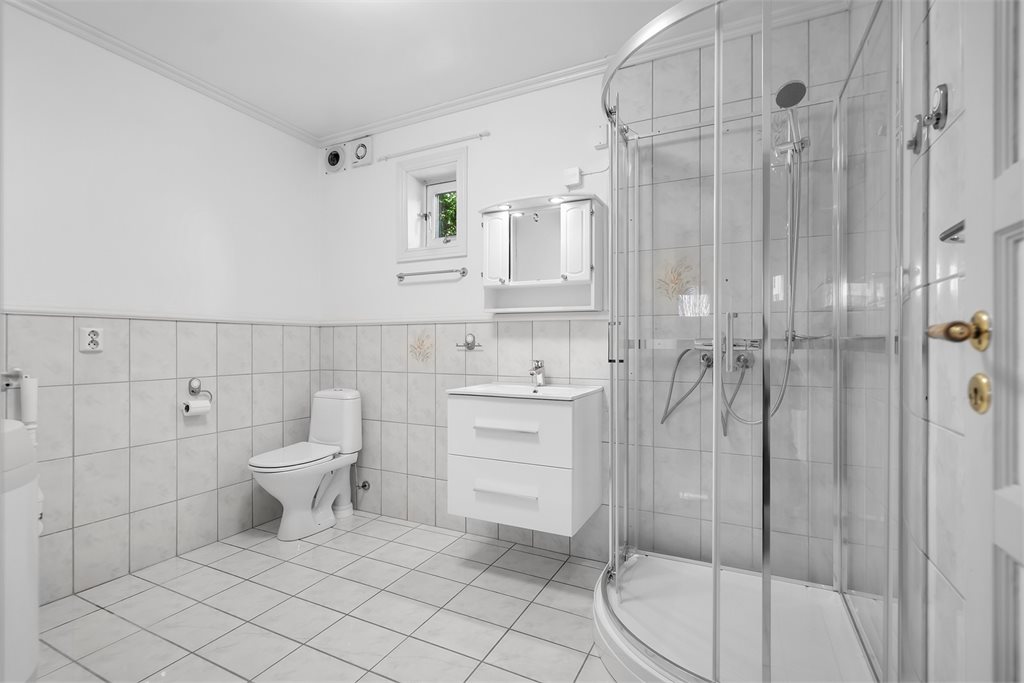 Rommet har innredning med nedfelt servant, toalett, dusjkabinett og opplegg for vaskemaskin.
