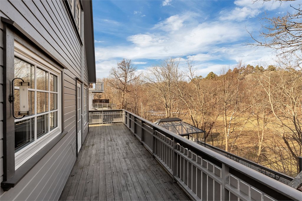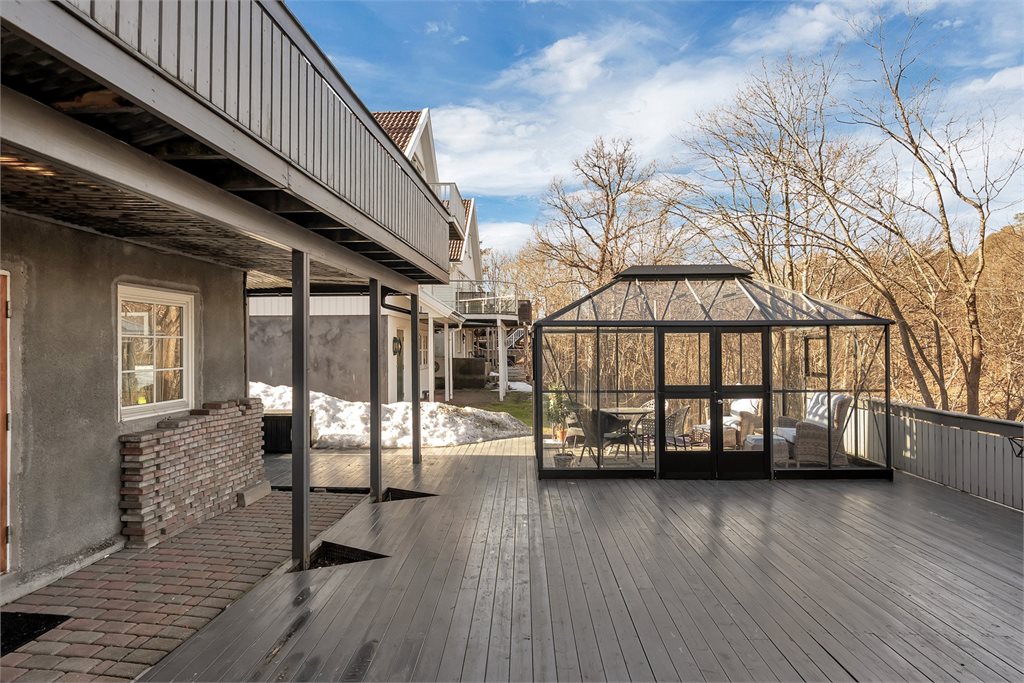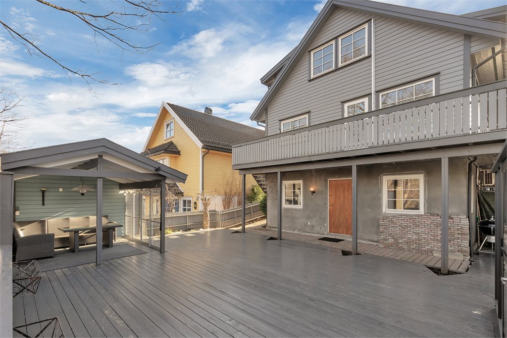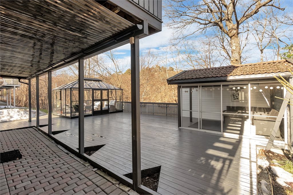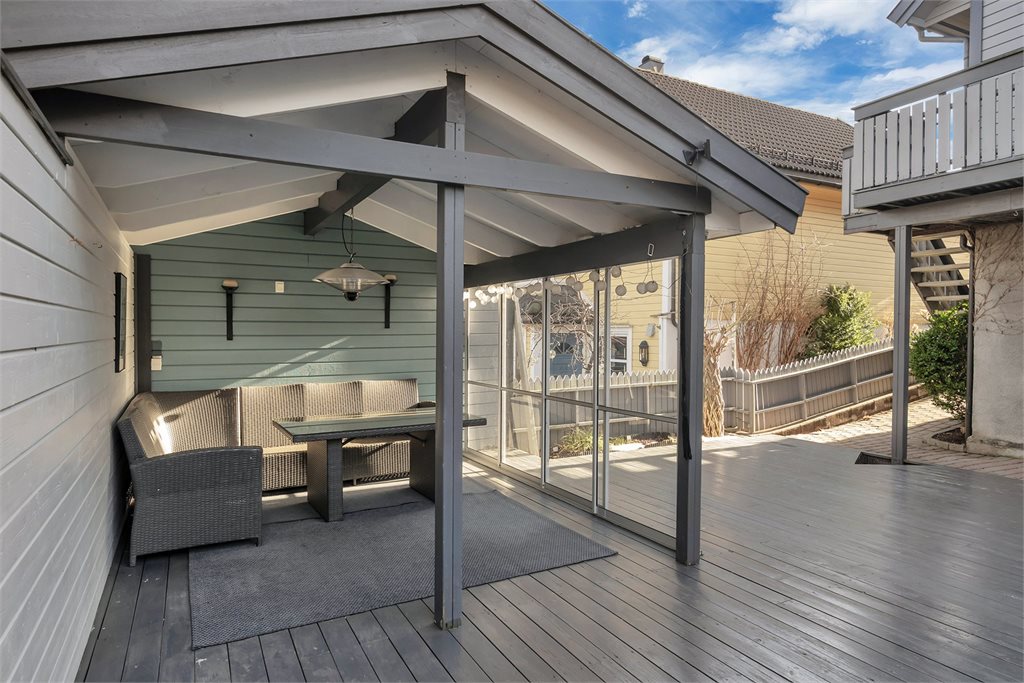 Veranda med utgang fra stue. Dekke av terrassebord. Rekkverk av tre.