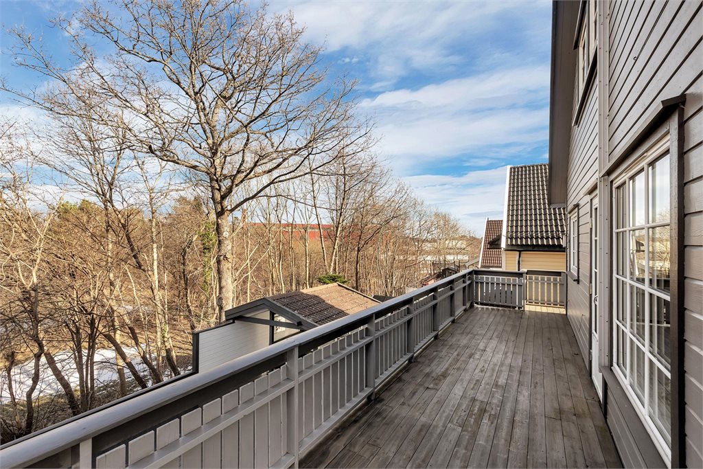 Bygningen har eldre ytterdør i tre inn til leiligheten og malt balkongdør i tre.