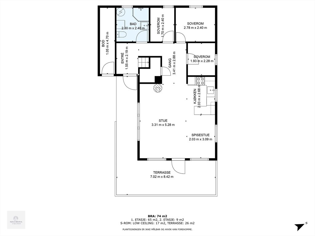 Stue/kjøkken , Entré , Bod ,Bad/vaskerom , Soverom , Soverom 2, Soverom 3Tomt