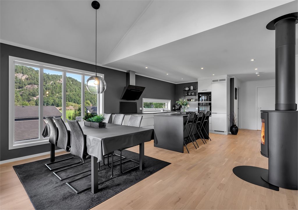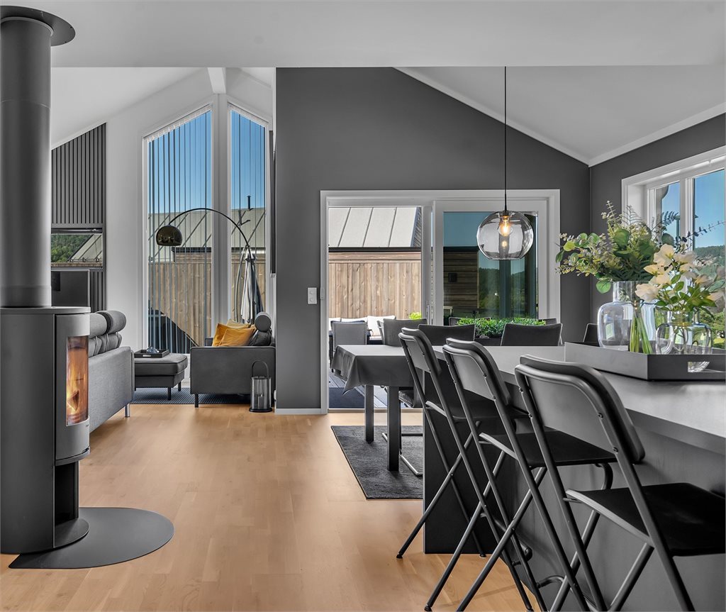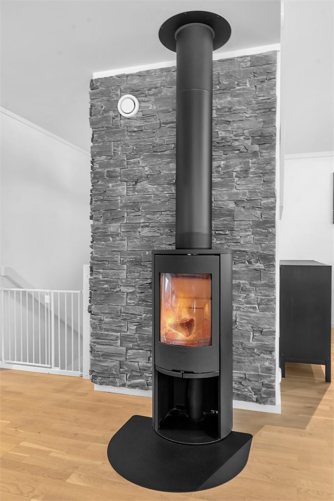 Boligen varmes opp med varmepumpe, ved og strøm.Vegg-/fastmonterte ovner som står i boligen ved framvisning medfølger i handelen.