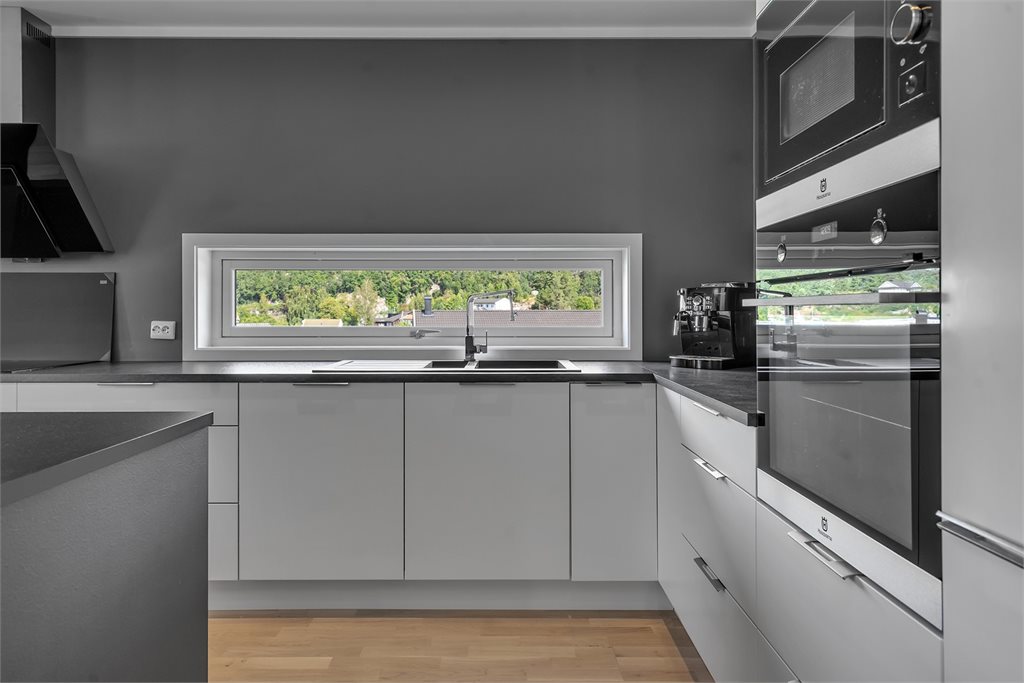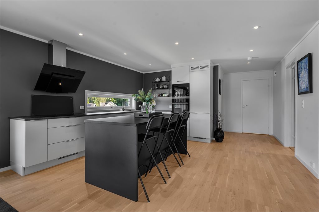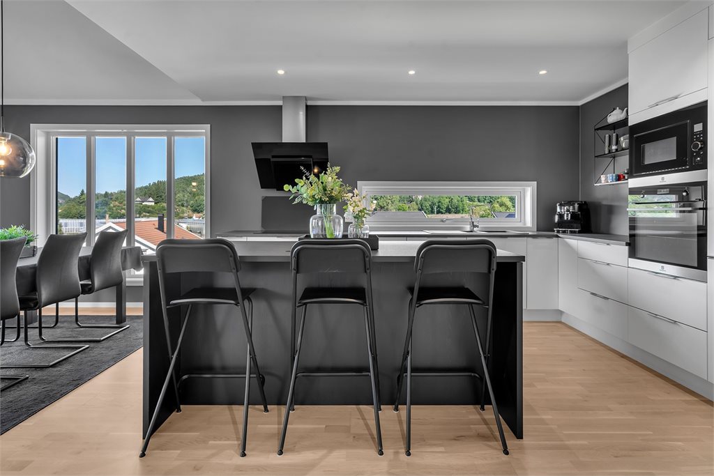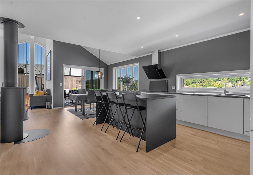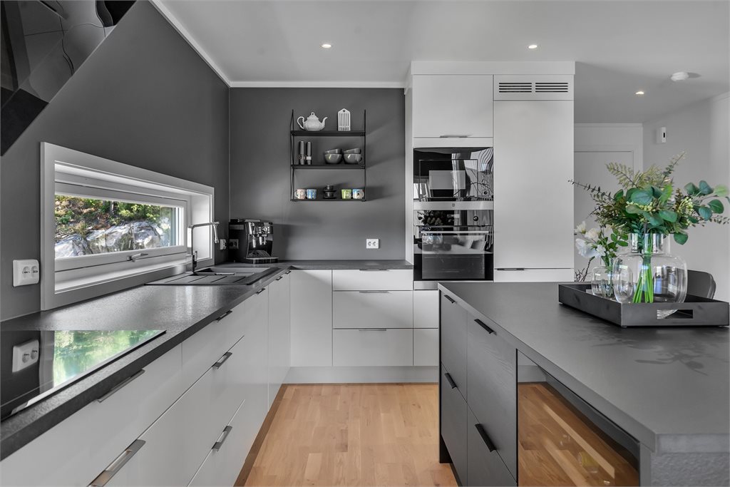Kjøkkenet har innredning med glatte fronter. Benkeplaten er av stein.