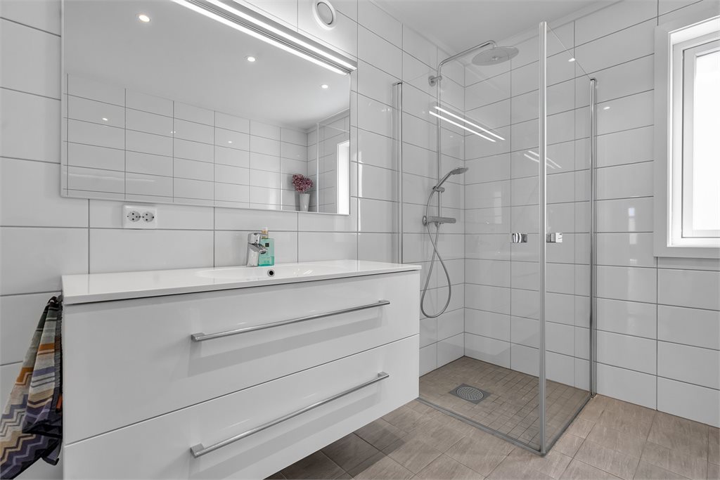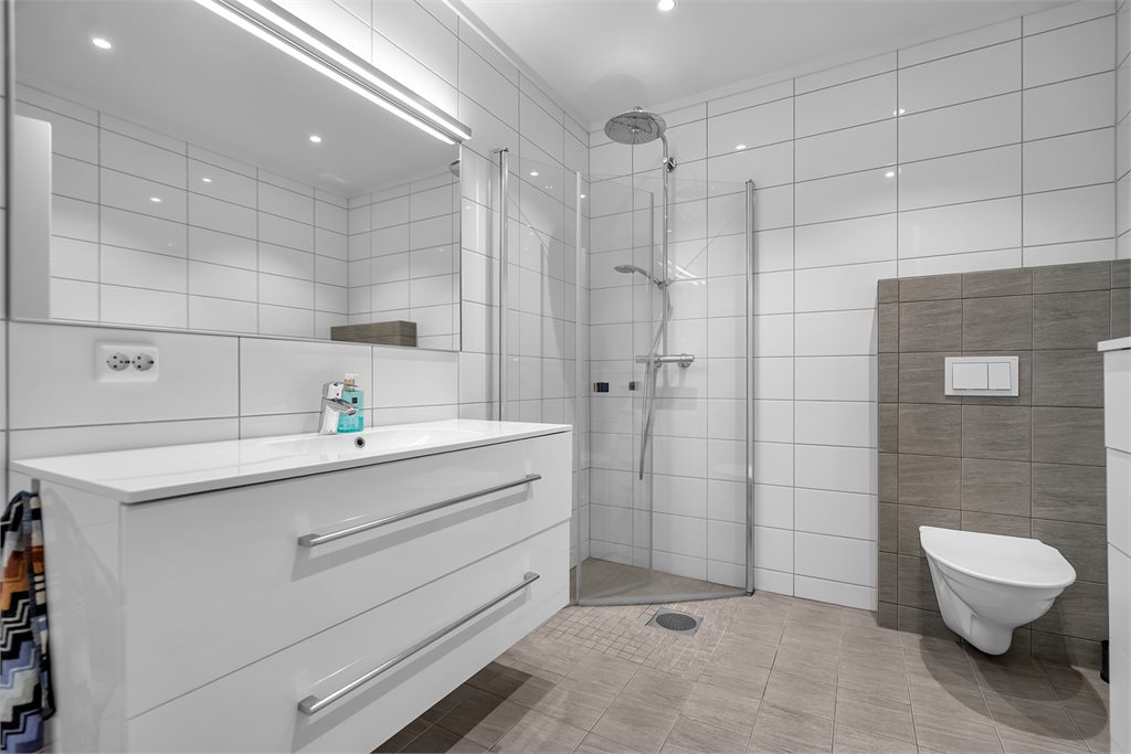 Rommet har innredning med nedfelt servant, veggmontert toalett og dusjvegger/hjørne.