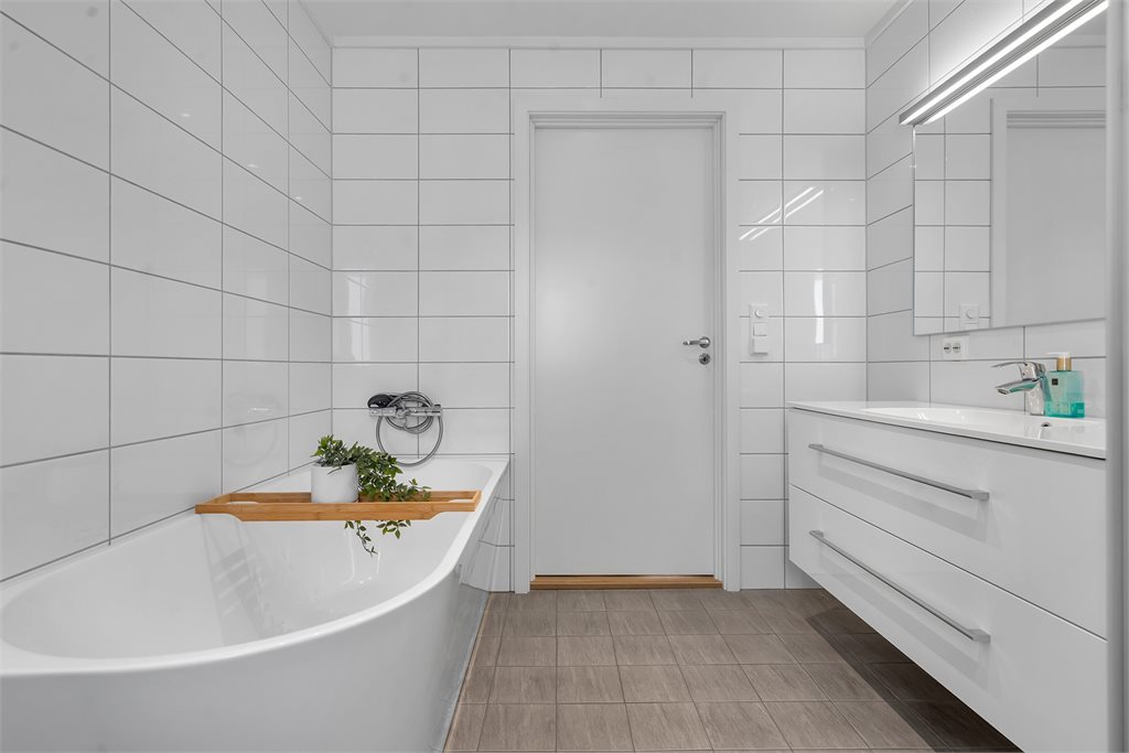 Rommet har innredning med nedfelt servant, veggmontert toalett, badekar og dusjvegger/hjørne.