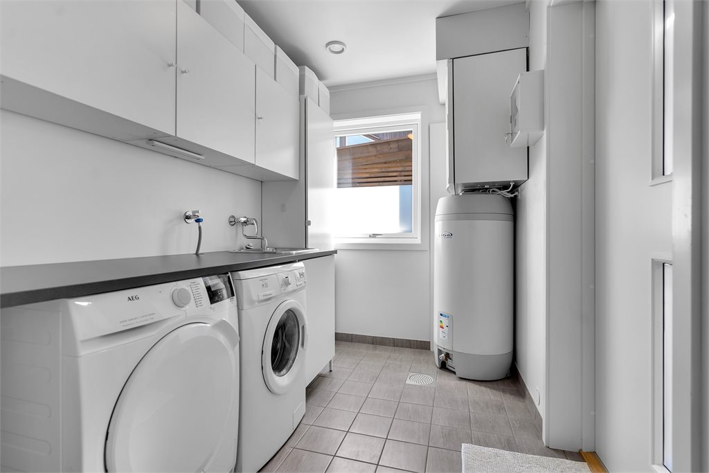 Rommet har innredning med nedfelt servant og opplegg for vaskemaskin.