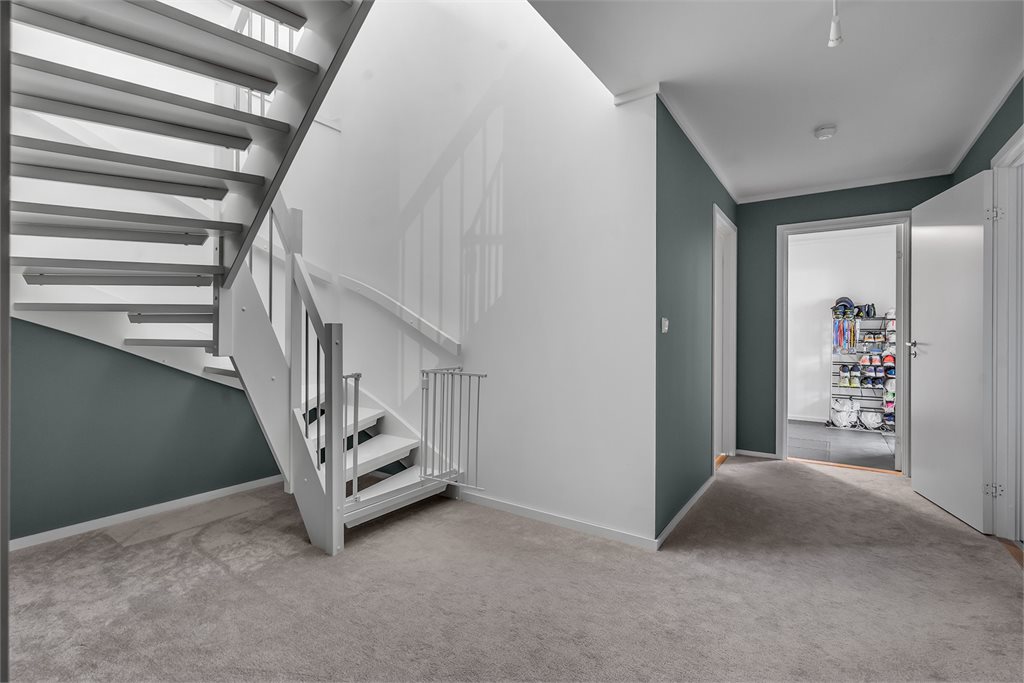Innvendig er det gulv av parkett og laminat. Veggene har malte