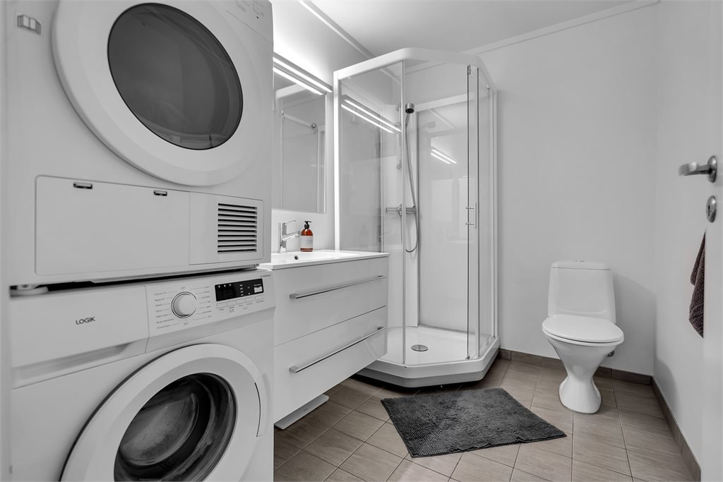 Rommet har innredning med nedfelt servant, toalett, dusjkabinett og opplegg for vaskemaskin.