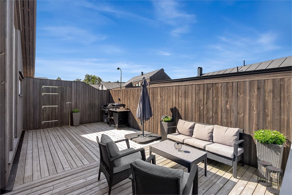 Veranda med utgang fra stue. Dekke av terrassebord. Rekkverk av tre.