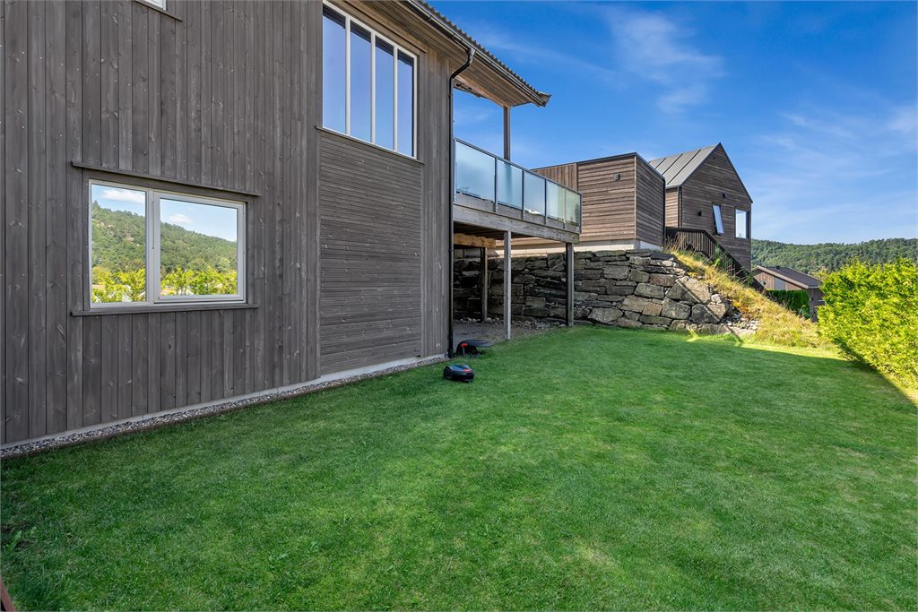 Pent opparbeidet tomt med gressplen og diverse beplantning. Stor asfaltert gårdsplass.Standard