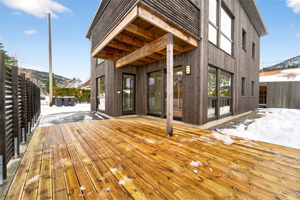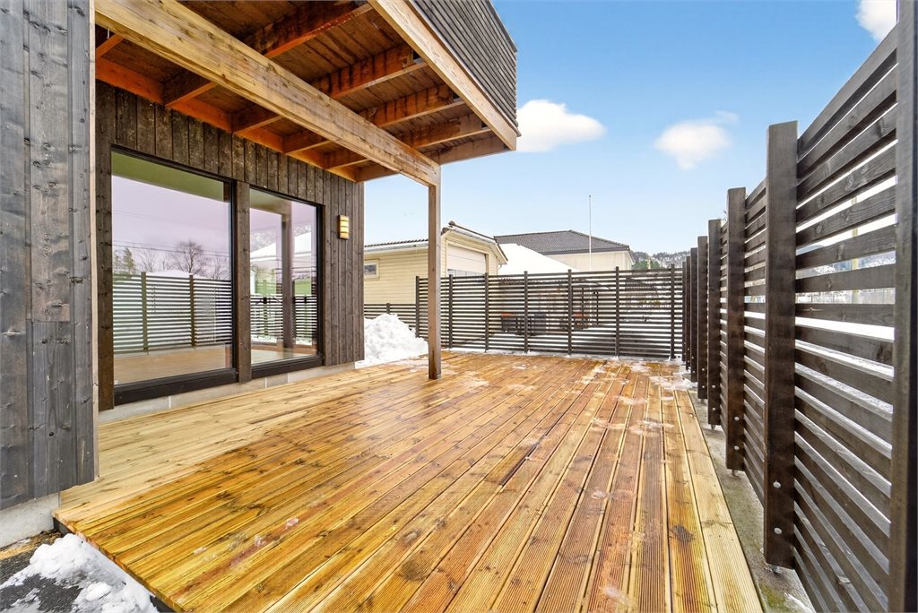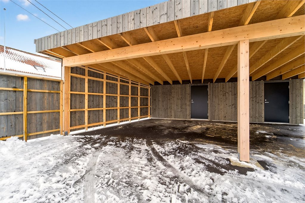 Felles eiet tomt. Terrasse og deler av uteområde foran leiligheten er seksjonert tilhørende seksjon 1. Ellers er det felles innkjørsel til carportene.Standard