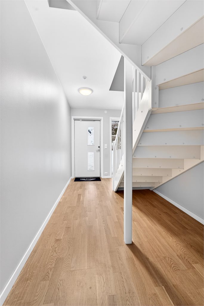 Innvendig trapp mellom etasjer er utført i tre.