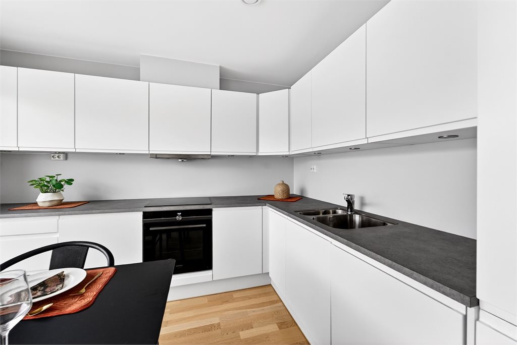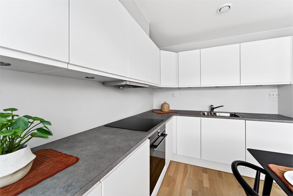 Kjøkkeninnredning med glatte fronter og laminert benkeplate.