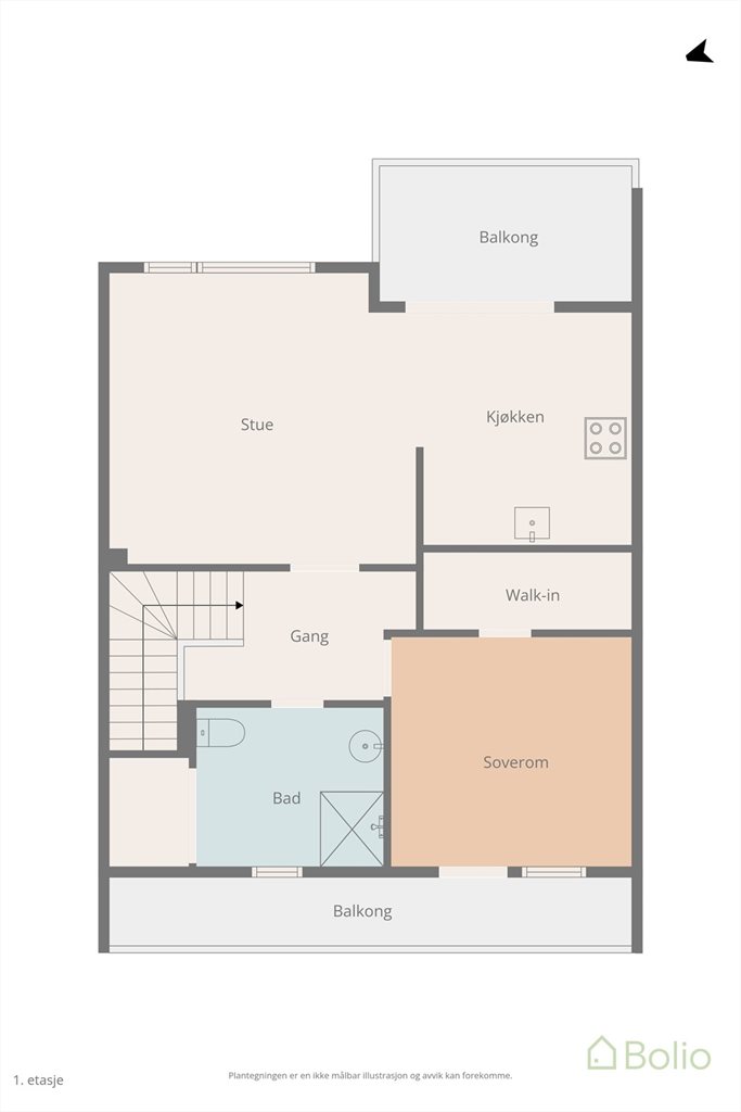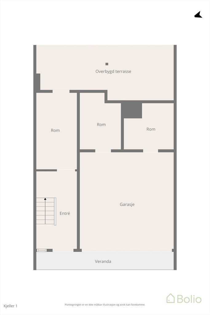 1. etasje: Entré og soverom, bod og garasje.2. etasje: Stue, kjøkken, bad/vaskerom, soverom, gang og garderobe.