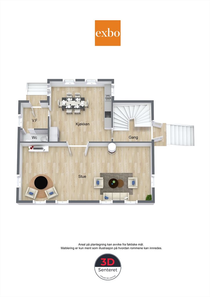 1. Etasje: Entré, Toalettrom, Kjøkken, Gang, Stue.2. Etasje: 3 soverom, Teknisk rom, Bad, Gang.