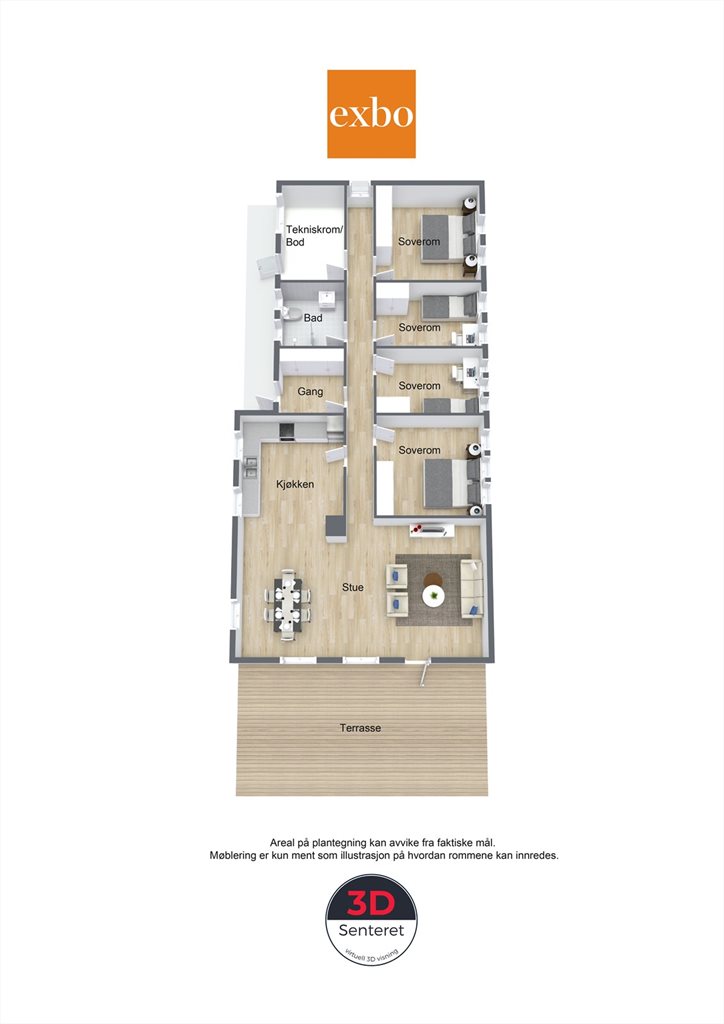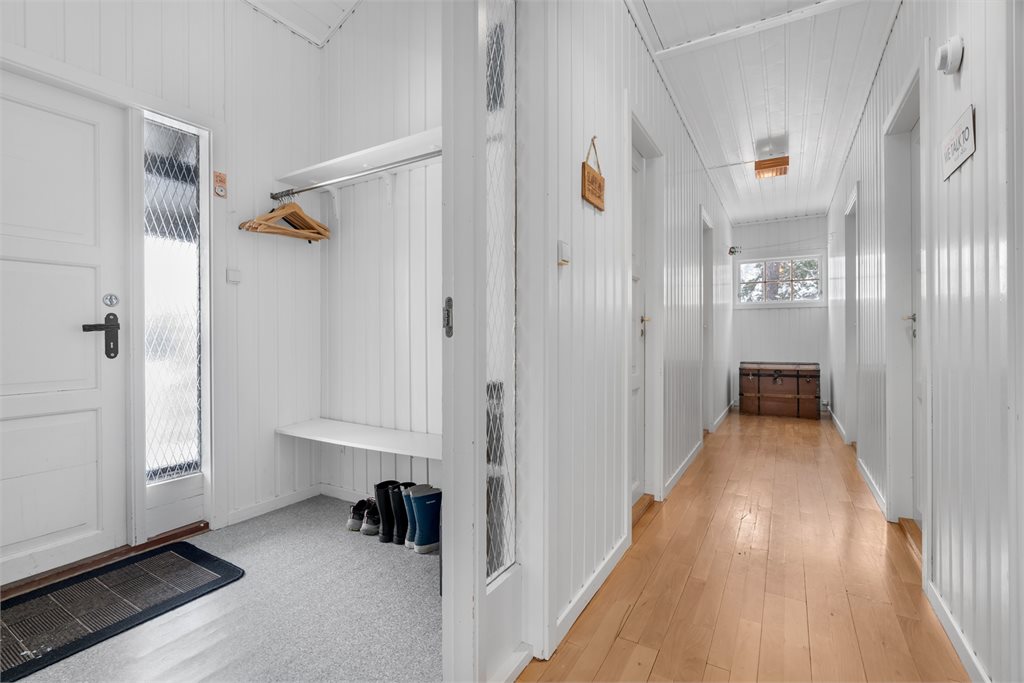 Entré, gang, toalettrom, rom med dusj, soverom 1, soverom 2, soverom 3, soverom 4 og stue/kjøkken.Tomt