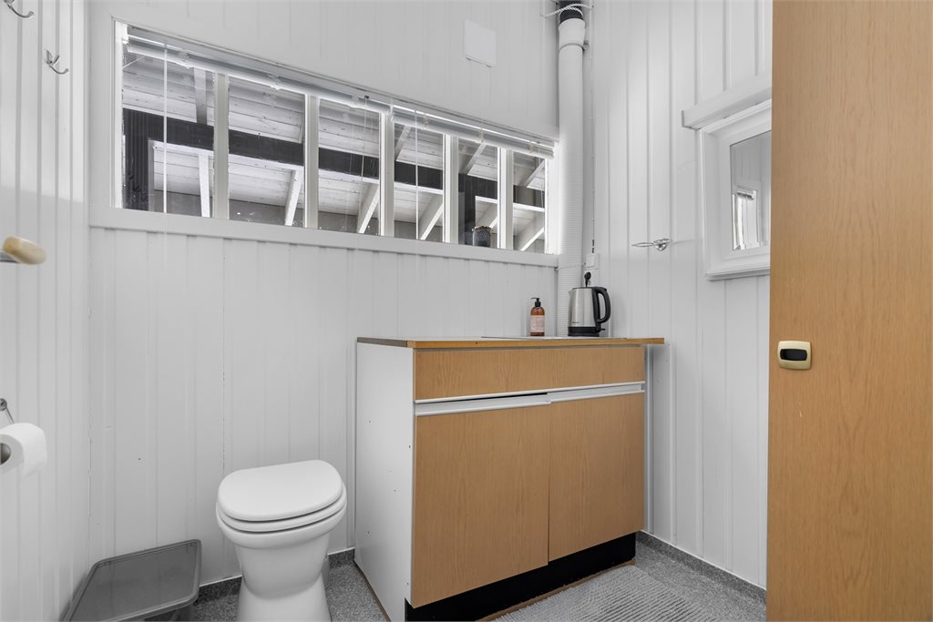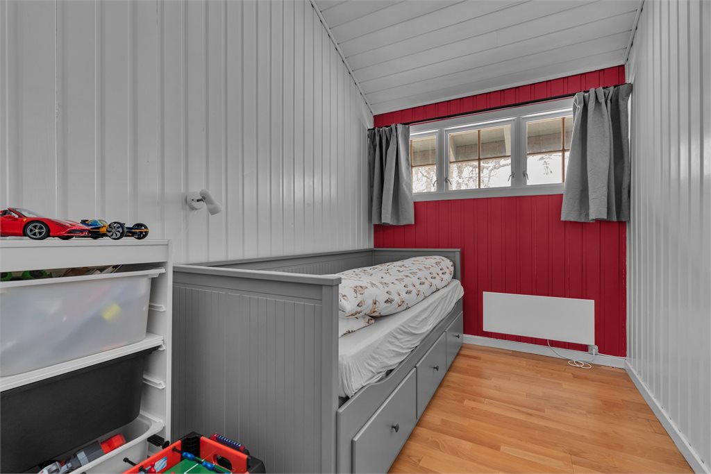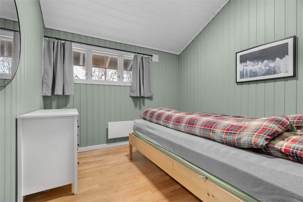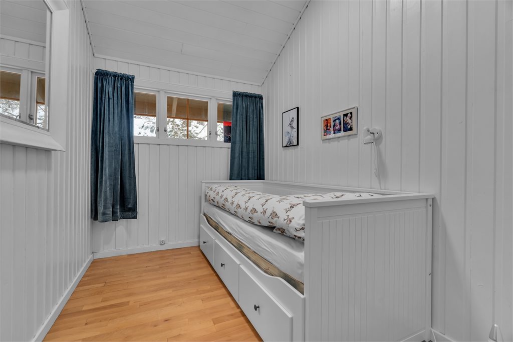På gulvet er det belegg. Vegger og tak med overflater av trepanel.