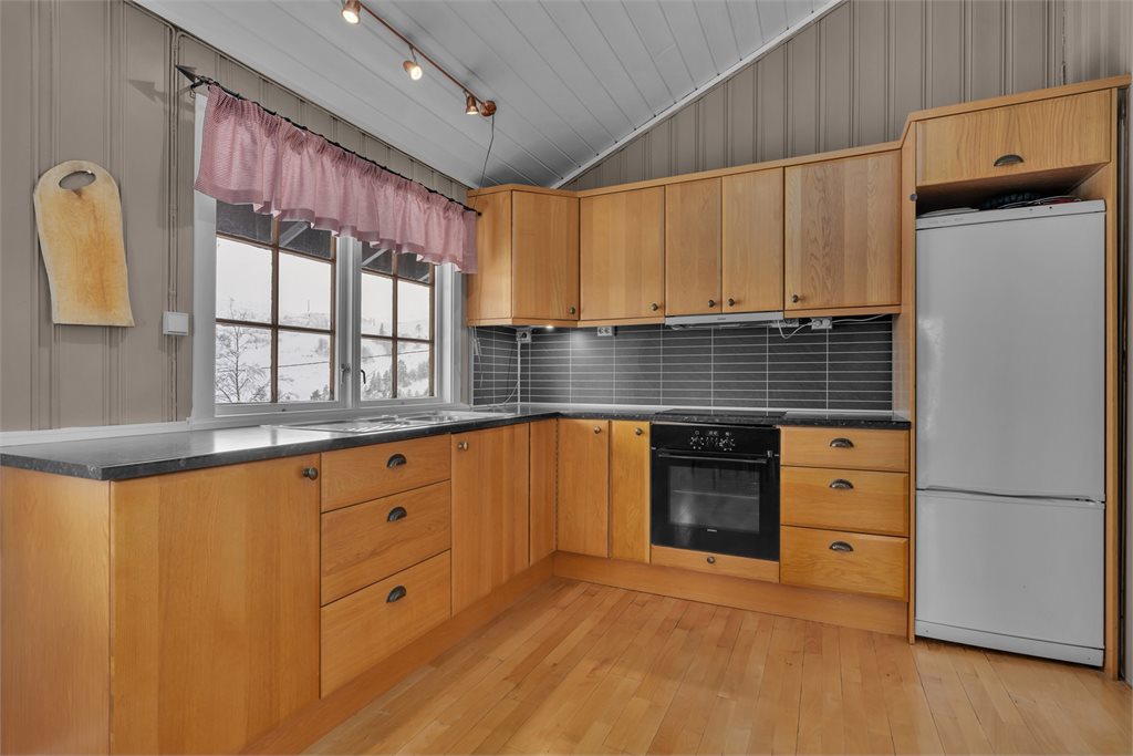 Kjøkkenet har innredning med profilerte fronter. Benkeplaten er av laminat.