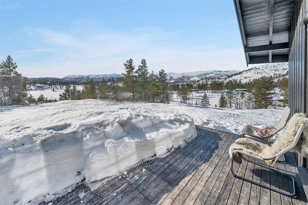 Veranda ved inngangspartiet og i front av hytta. Dekke av terrassebord.