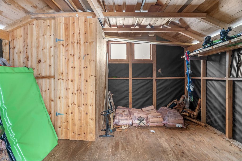 Innvendig er det gulv av parkett. Veggene har trepanel. Innvendige tak har trepanel.