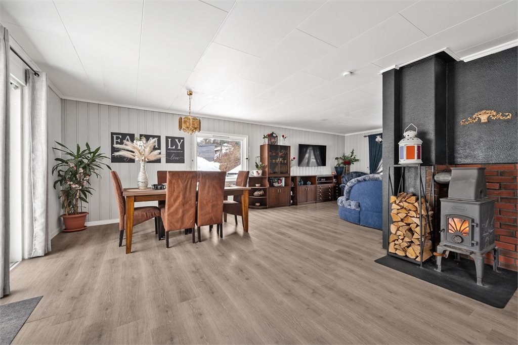 Oppvarmingskilder: Vedovn i stue og i kjeller. Ellers elektrisk oppvarming.Vegg-/fastmonterte ovner som står i boligen ved framvisning medfølger i handelen.