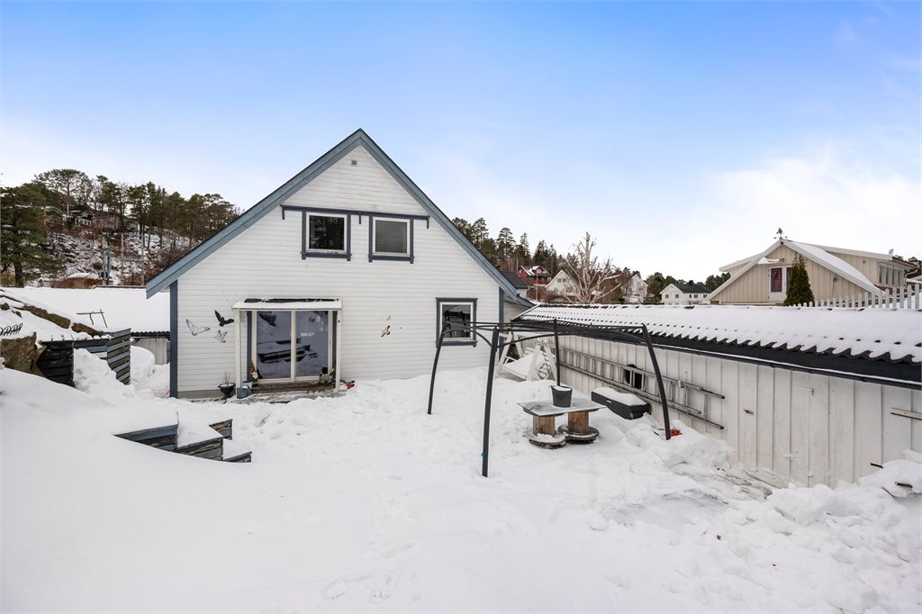 Kledning og utvendig treverk har varierende slitasje, på utsatte steder vær slitasje og noe råte. Skjevhet/ufagmessig utførelse ved tilbygg.