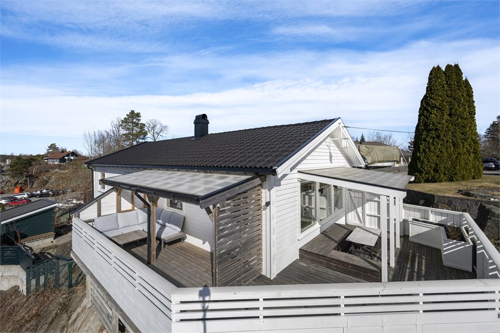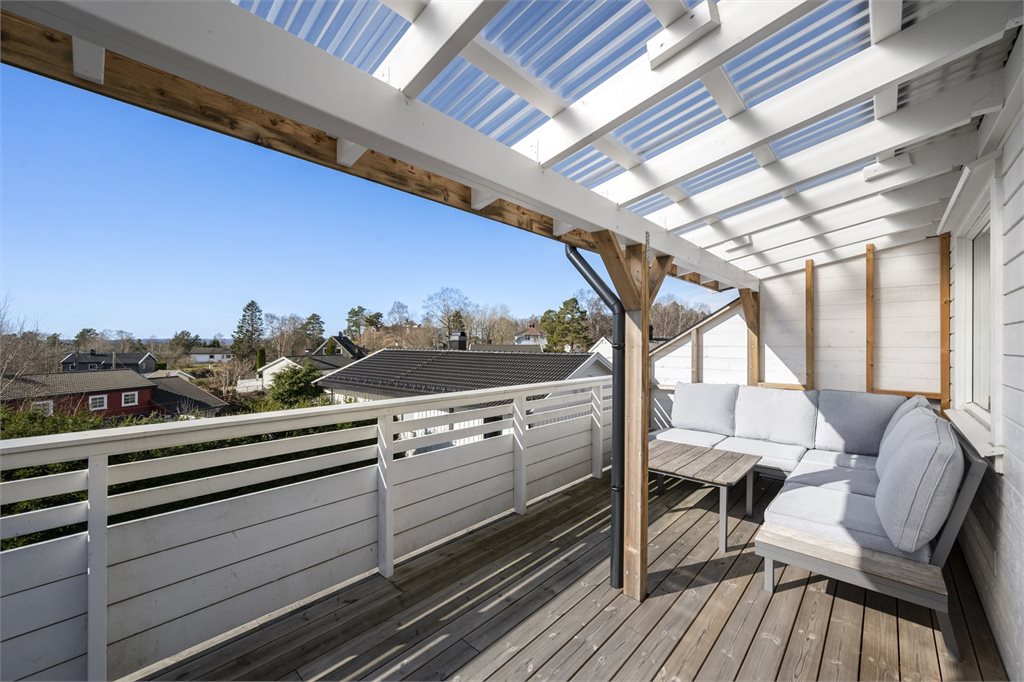 Opp på toppen av tomten har man en svært flott sitteplass hvor man er totalt usjenert og kan nyte sol hele dagen og utover kvelden.