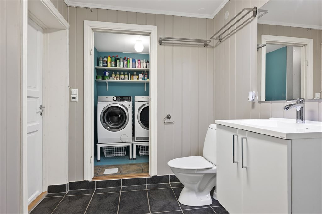 Det som på originale tegninger i kjeller er vaskerom og tørkerom er idag vaskerom, bad og bod.