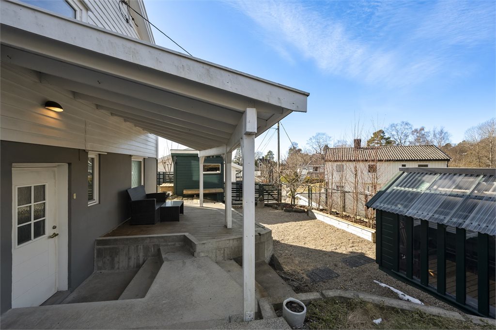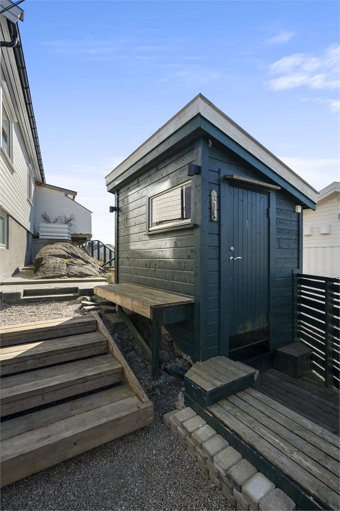 Hagen er meget pent opparbeidet i ulike nivåer noe som gir tomten liv. Parkeringen er asfaltert oppe ved boligen samt at det er en gruset parkering på boligens fremside nedenfor verandaen. Ved boligen er det satt opp sykkelparkering under tak, meget praktisk.Videre er det murt opp nye trappearrangementer som leder ned mot det svært hyggelige grusede område hvor det står ett stort drivhus, flere bed noe i tre og noen steinsatt. Plattinger og sitteplasser flere steder på tomten.