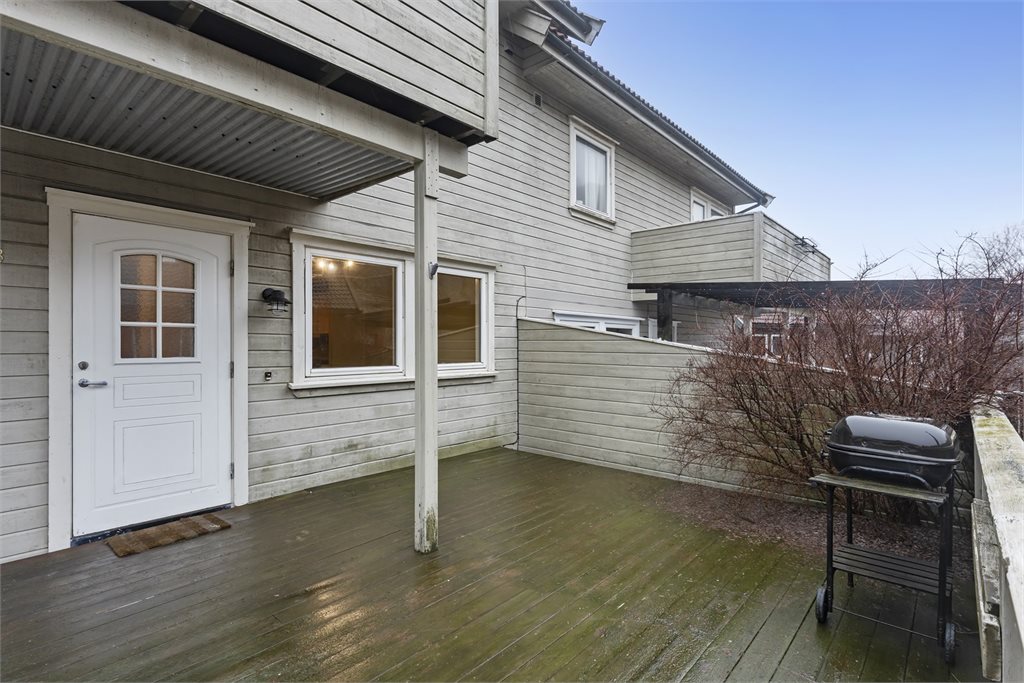 Fellestomt. Opparbeidet med romslig terrasse tilhørende seksjonen. Eller felles, asfaltert parkeringsplass.Standard